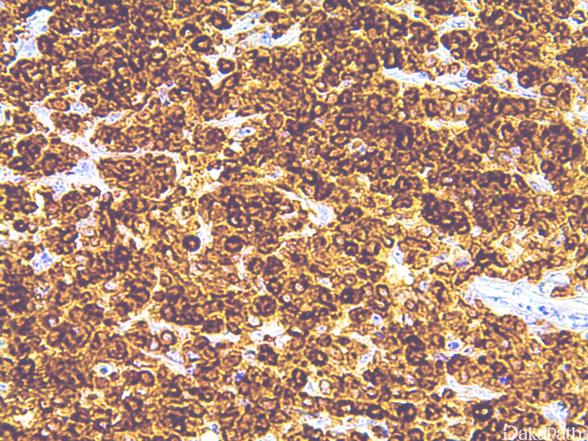 少数阳性(<35%,≥15%的病例阳性): 卵巢子宫内膜样癌、结直肠腺癌、纤维肉瘤、平滑肌肉瘤,NOS、肝细胞癌、恶性外周神经鞘膜瘤、肾上腺皮质癌、肾细胞癌伴 Xp11.2 异位、类癌、肾上腺皮脂腺瘤、阑尾腺癌、尤文肉瘤、卵巢低级别浆液性癌、阑尾囊腺瘤、梭形和上皮样细胞痣、炎性假瘤、脑膜瘤,NOS、卵巢黏液性癌、结节性淋巴细胞为主型霍奇金淋巴瘤、室管膜瘤、基底样鳞状细胞癌、腹膜原发性腺癌、肾上腺皮质肿瘤,NOS、宫颈腺癌,非特指型、卵巢浆液性癌、室管膜母细胞瘤、胰胆管囊腺癌伴间叶性间质,黏液、室管膜下巨细胞星形细胞瘤、巢状尿路上皮癌、甲状腺未分化癌、甲状腺嗜酸细胞腺瘤、肛管鳞状细胞癌、肛管鳞状细胞癌、胃腺癌、乳腺浸润性小叶癌、胰腺导管腺癌