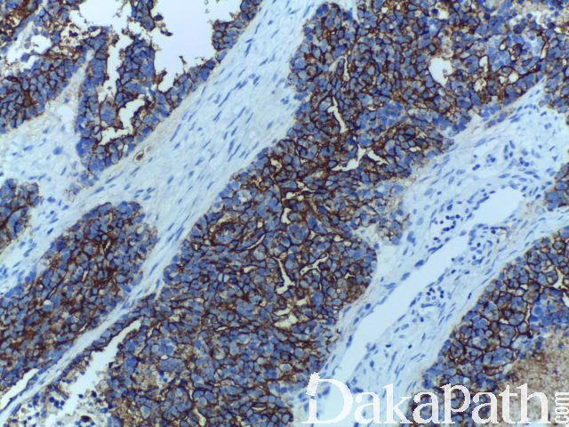 - 几乎所有卵巢浆液性腺癌表达阳性,黏液性肿瘤阴性或弱表达。结肠癌、乳腺癌、子宫腺瘤样瘤、肺细支气管肺泡癌亦可有表达。