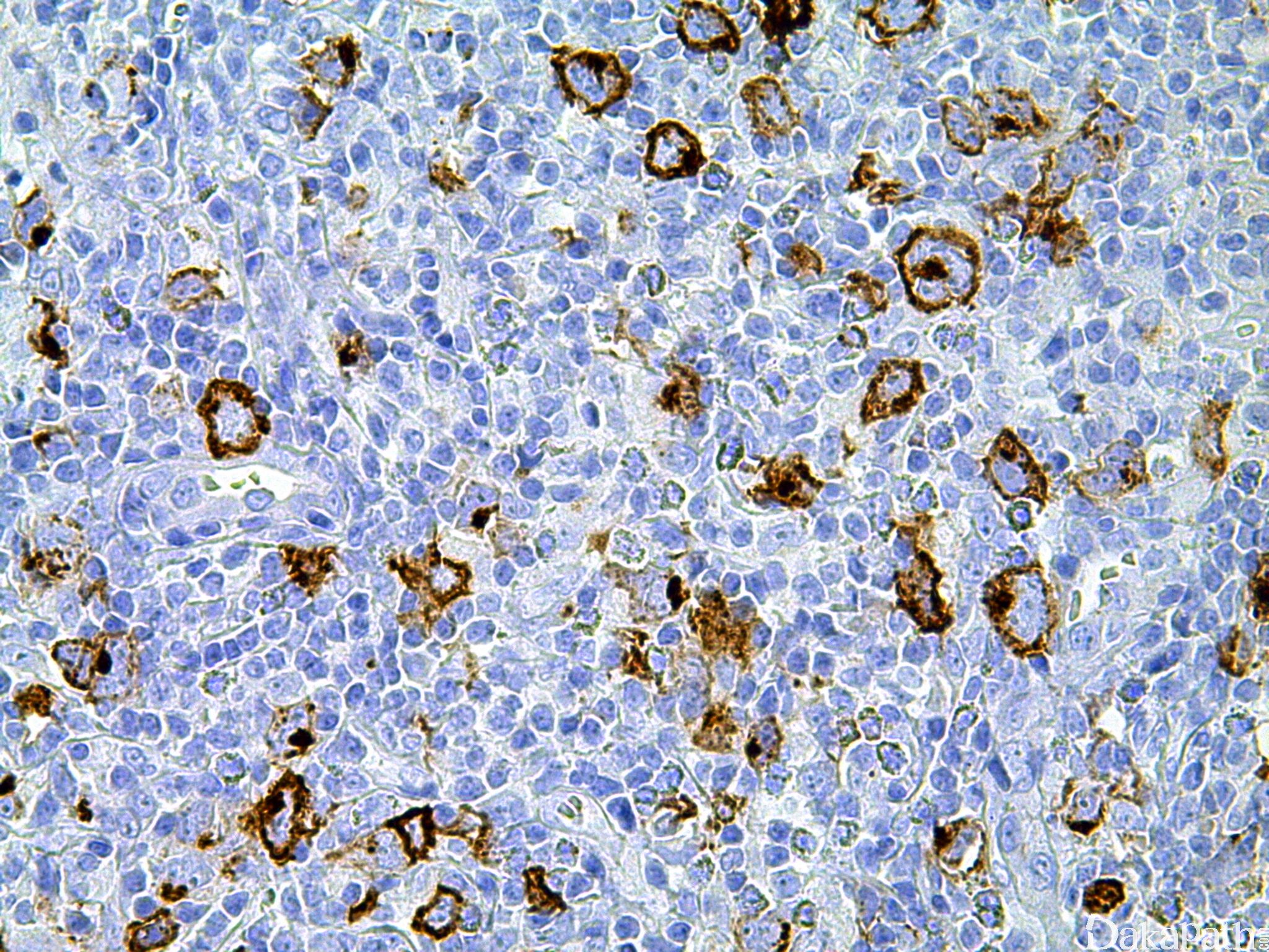 是一种碳水化合物,标记何杰金 R-S 细胞,髓细胞白血病/肉瘤(是相对成熟髓细胞的标记物; CD117 标记相对幼稚的髓细胞,而 MPO 是相对广谱的髓细胞标记物)。腺癌阳性,可用于与间皮瘤( -)鉴别,但效果不如 BerEP4 等其它腺癌标志物。