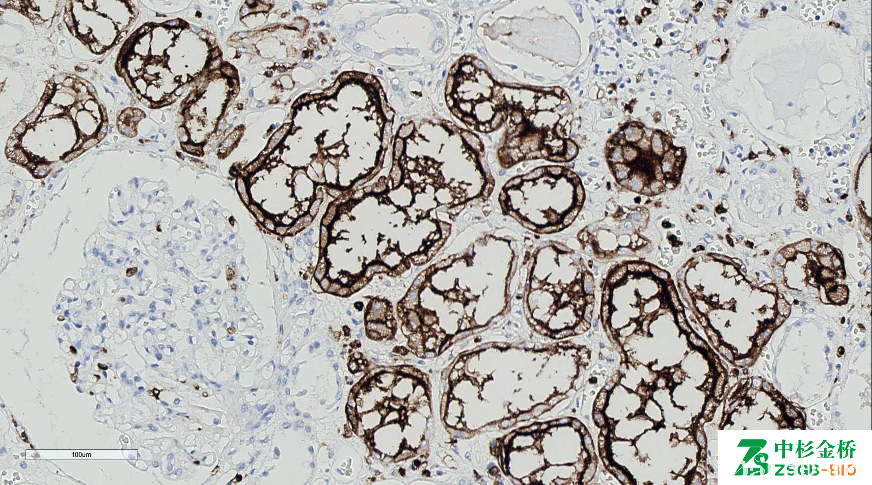 几乎全部阳性(≥95%的病例阳性): 结直肠腺癌、乳头状肾细胞癌、膀胱透明细胞癌、毛发上皮瘤、大汗腺腺瘤、卵巢透明细胞癌、皮肤大汗腺腺癌、胸腺乳头状癌、睾丸交界性乳头状浆液性肿瘤、睾丸浆液性囊腺瘤、涎腺小管腺瘤、肾嗜酸细胞瘤、皮肤小汗腺乳头状腺瘤