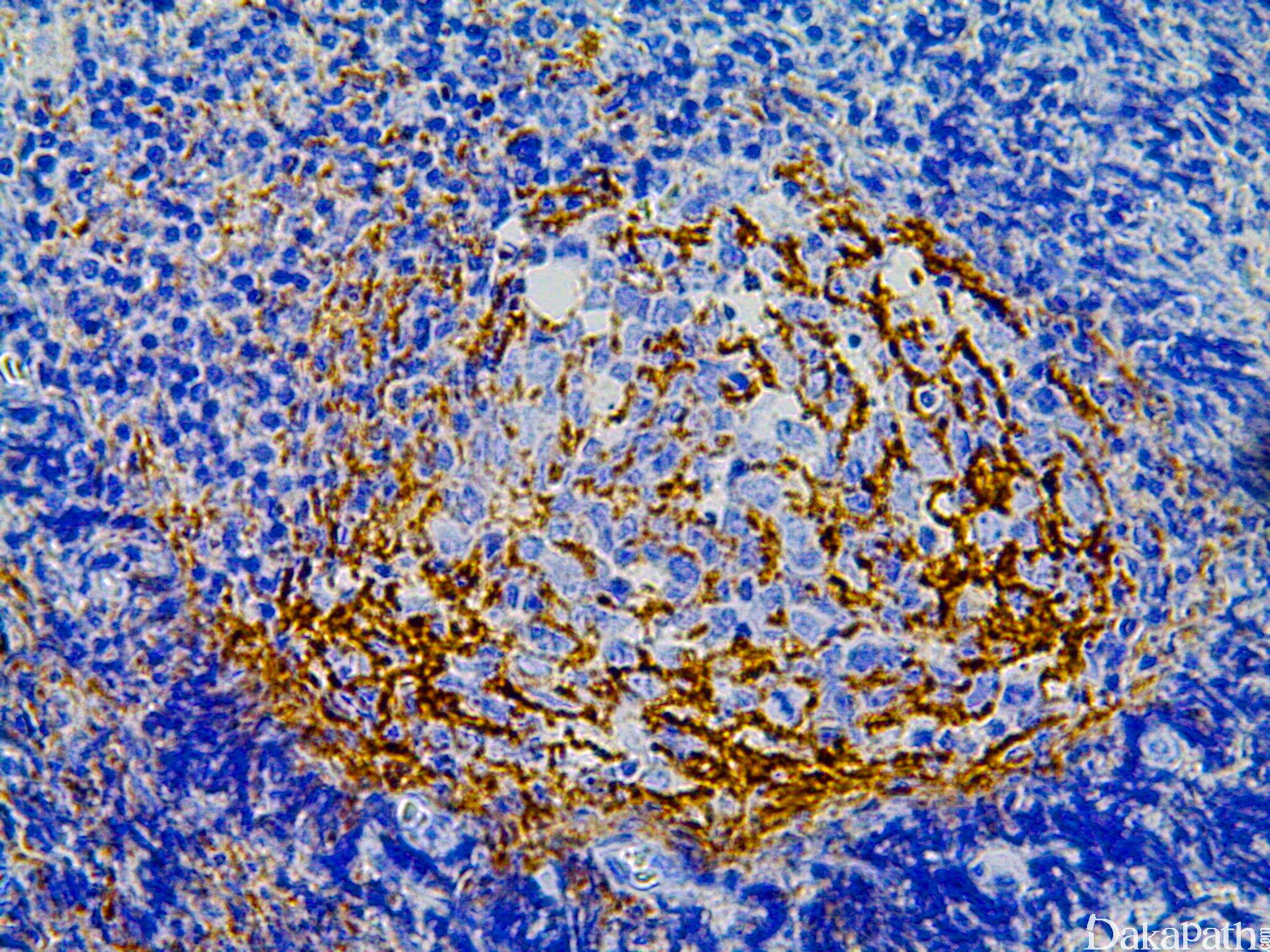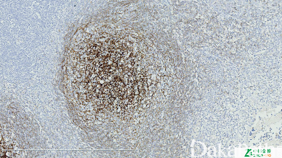 2. 显示滤泡树突网(脾脏边缘区淋巴瘤滤泡树突网消失)。