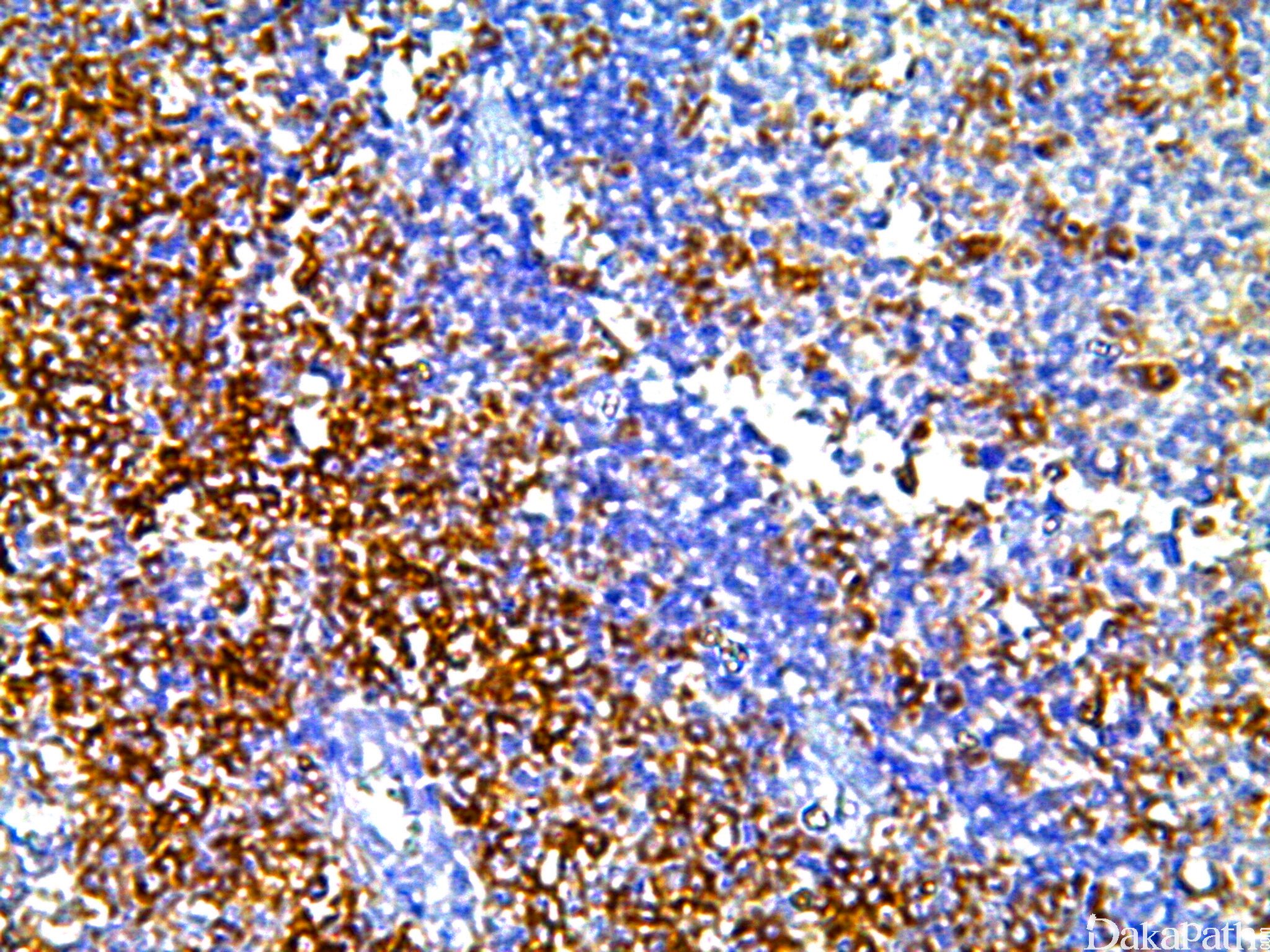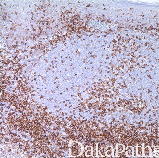 辅助 T 细胞标志物。多数巨噬细胞、滤泡树状突细胞、Langerhans 细胞也阳性。