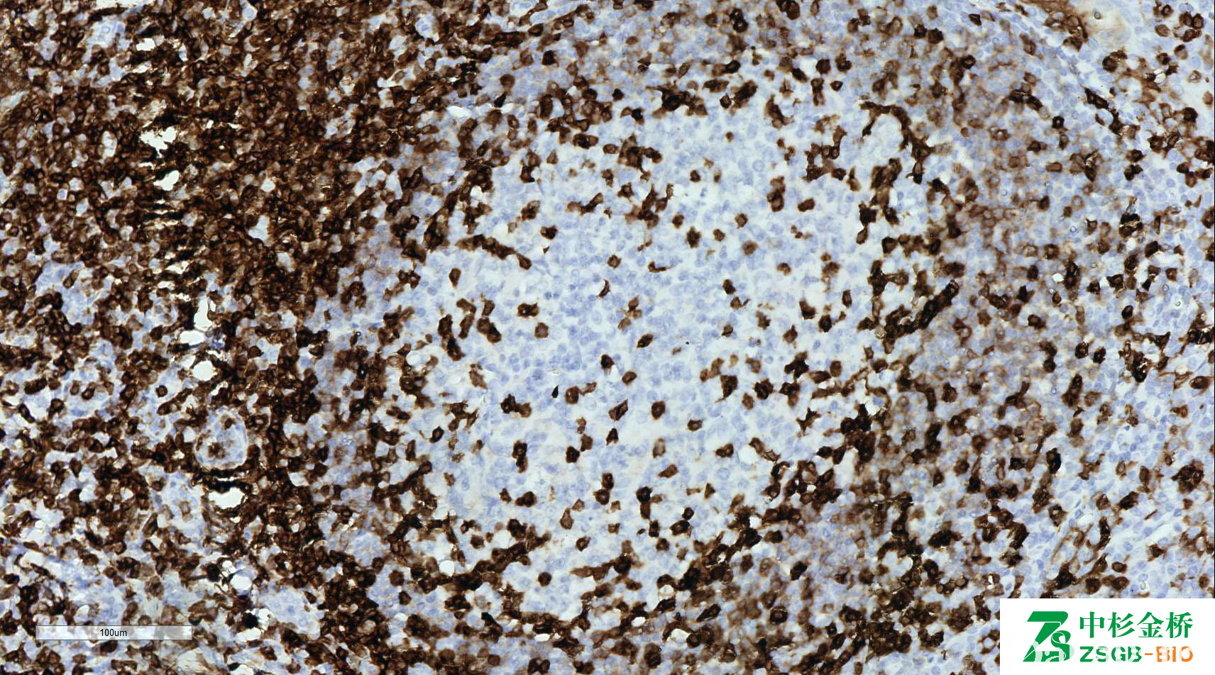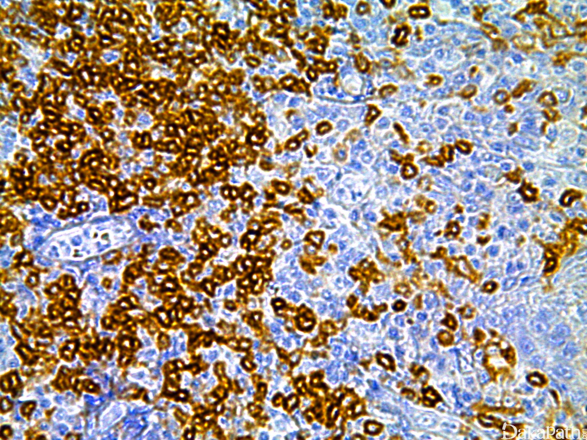 全 T 细胞标记,存在于人体 T 细胞表面的黏唐蛋白,少量正常 B 细胞及小 B 细胞淋巴瘤(CLL、MCL)阳性。