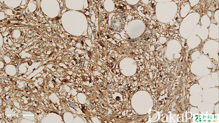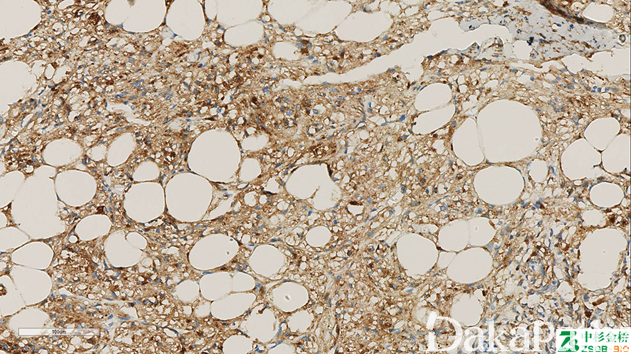 通常阳性(<95%,≥75%的病例阳性): 恶性黑色素瘤、前列腺腺泡性癌、嗜铬细胞瘤、血管肌脂肪瘤、蜕膜样间皮瘤、乳腺 Paget 病、皮肤 Merkel 细胞癌、神经鞘黏液瘤,细胞型和混合性、黄色肉芽肿、环状肉芽肿