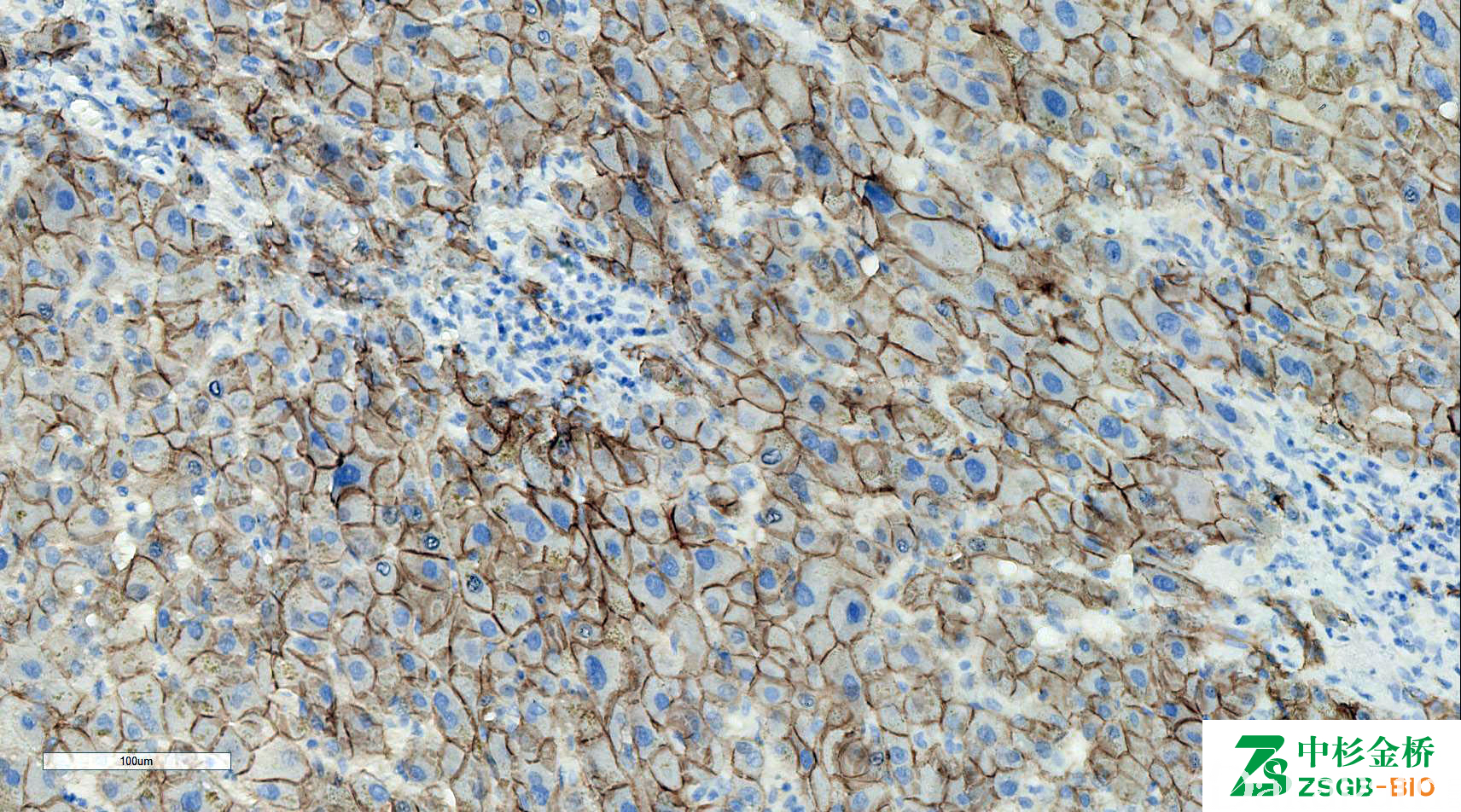 钙黏附蛋白家族成员之一,上皮-钙黏附蛋白,钙依赖跨膜上皮蛋白,促进细胞黏附,间皮瘤阳性,部分转移性腺癌有时阳性。可用于鉴别乳腺导管癌(+)和小叶癌(-)。