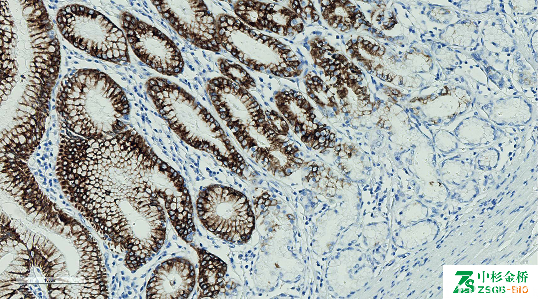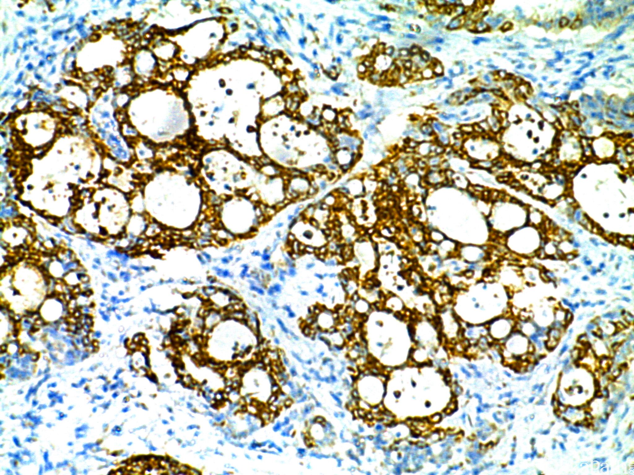 几乎全部阳性(≥95%的病例阳性): 鼻窦印戒细胞癌、胃幽门腺腺瘤、胰腺导管内管状腺瘤,幽门腺型、胰腺导管内乳头状癌、胰腺导管内乳头状癌伴浸润成分、胰腺交界性导管内乳头状瘤、胰腺嗜酸细胞型导管内乳头状癌、胰腺嗜酸细胞型导管内乳头状癌伴浸润成分、胰腺黏液性非囊性癌、胰腺导管内乳头状肿瘤、卵巢黏液性交界性肿瘤/非典型增生性黏液性肿瘤、卵巢黏液性囊腺瘤、卵巢黏液性癌、胰腺导管内乳头状黏液性肿瘤、胰腺黏液性囊腺癌、乳腺外 Paget 病、胰腺低度恶性潜能黏液性囊腺癌、肺贴壁型腺癌,黏液性、胆管内乳头状肿瘤、卵巢交界性黏液性肿瘤,胃肠型、胰腺高级别上皮内瘤变