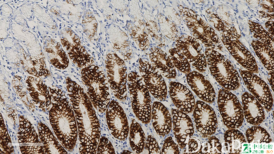 正常只表达于胃型上皮(包括壶腹),又称胃型黏液。MUC 系列用于黏液性肿瘤黏液上皮分化类型的鉴别。