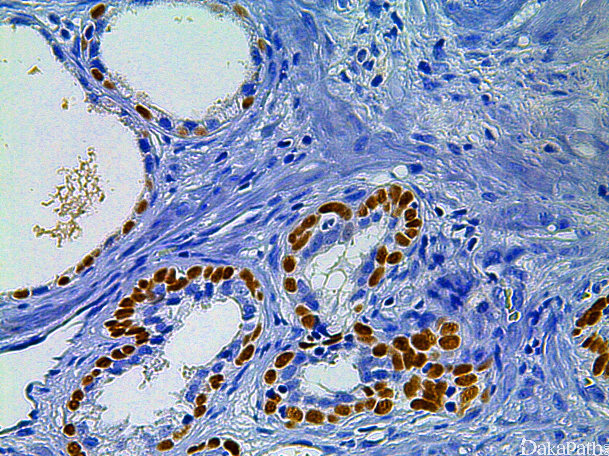 P53 家族成员,标记多种上皮的基底细胞,胸腺瘤中的上皮样成分 (+),标记肌上皮及其肿瘤。表达于鳞状上皮及尿路上皮的基底层和乳腺、前列腺、涎腺基底细胞。