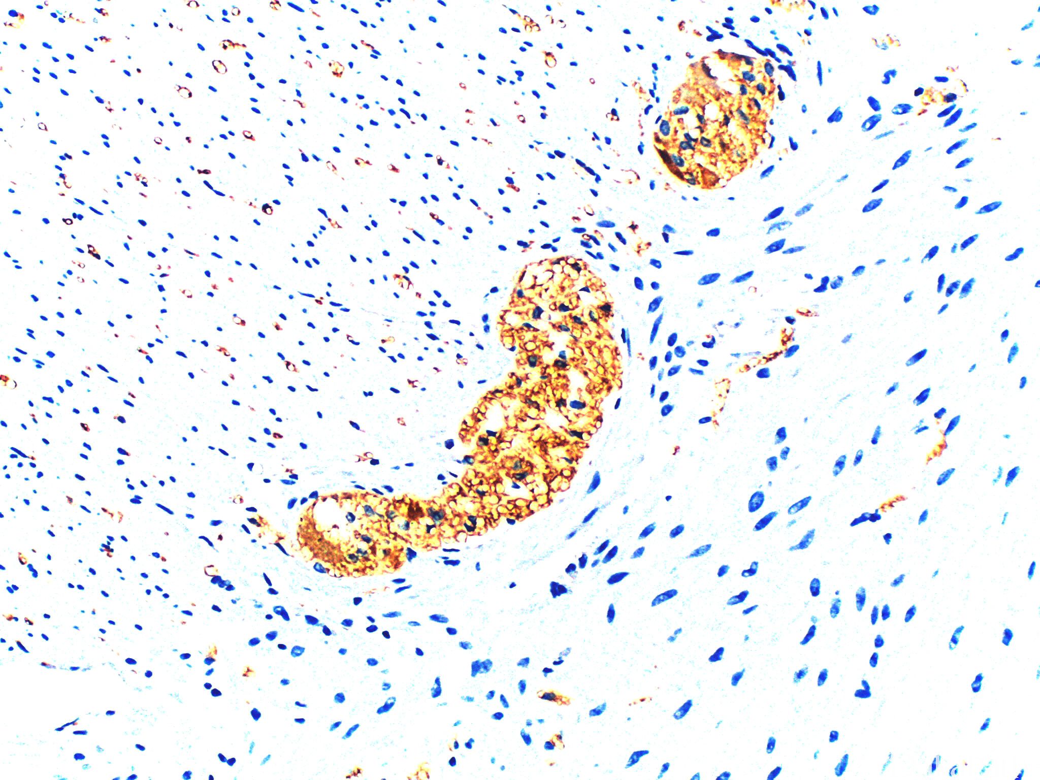 少数阳性(<35%,≥15%的病例阳性): 结直肠腺癌、隆突性皮肤纤维肉瘤、平滑肌肉瘤,NOS、神经鞘膜瘤,NOS、胰腺腺泡细胞癌、耳鼻喉鳞状细胞癌、子宫内膜腺癌、肺腺癌