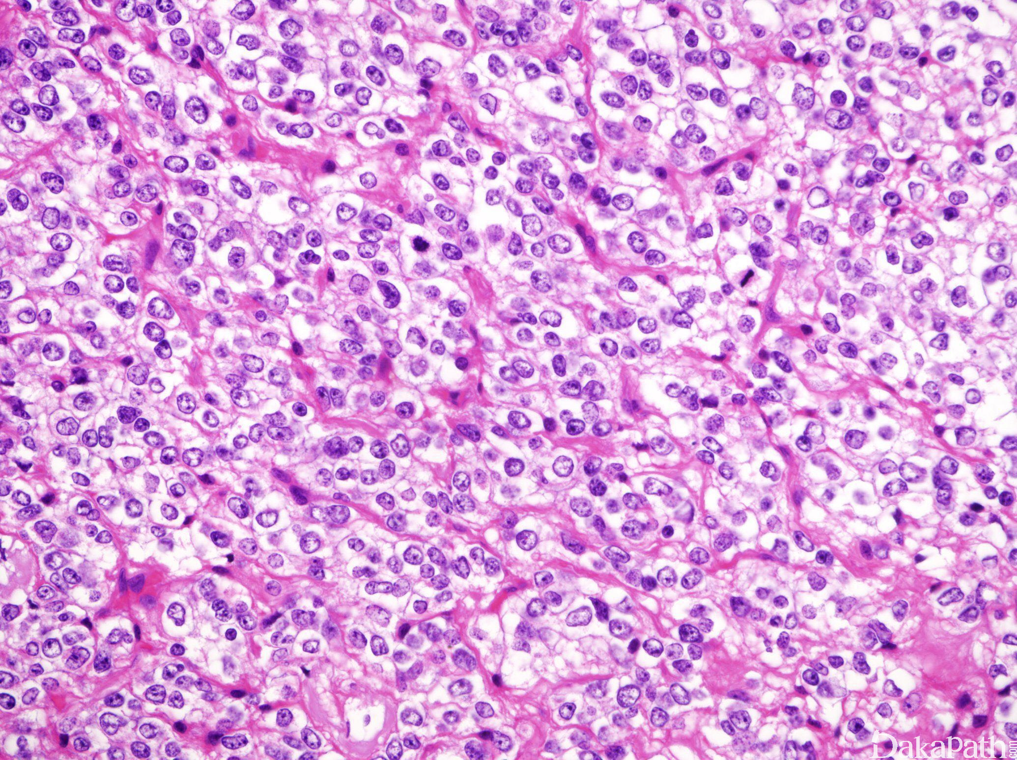 III 级肿瘤:可见胞浆内强嗜酸性颗粒。胞核呈上皮样改变的胞界清楚的大圆形细胞尤为多见。可见血管肥大/增生,肾小球样血管不常见。常见球形钙化;