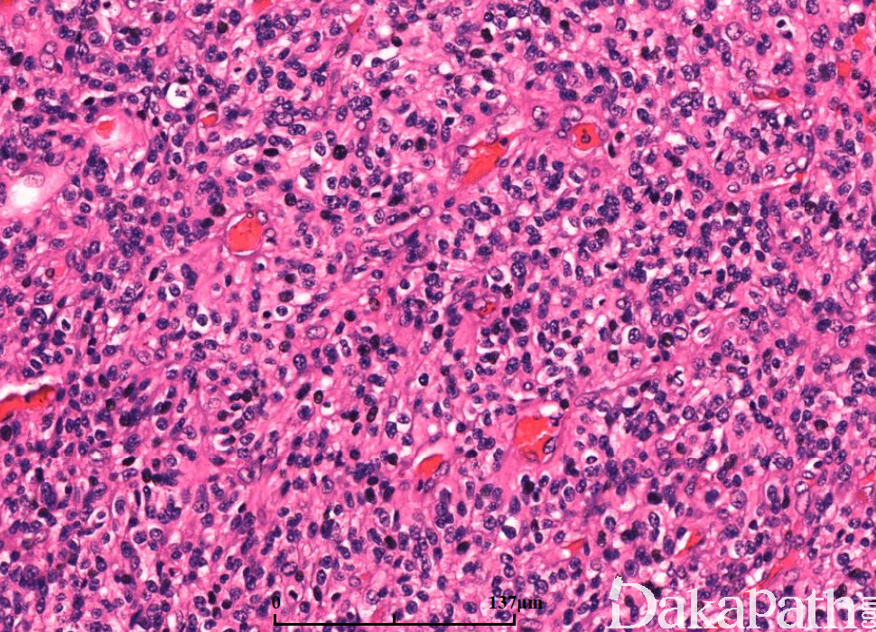 4. 原发性 CNS 淋巴瘤 :血管中心性,导致淋巴瘤细胞片状分布,细胞胞核圆形或不规则,核仁显著及胞浆稀少,可见大量凋亡,无血管增生。