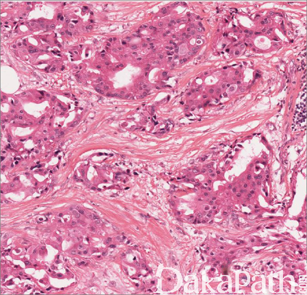 组织学上可表现为浸润性导管癌的各种形态,如巢状、片状、管状、微乳头状;