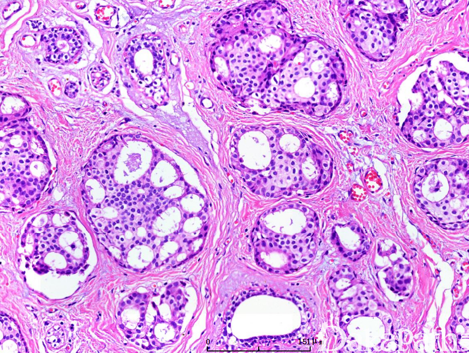 缺乏肌上皮细胞,常伴有筛状型导管原位癌;