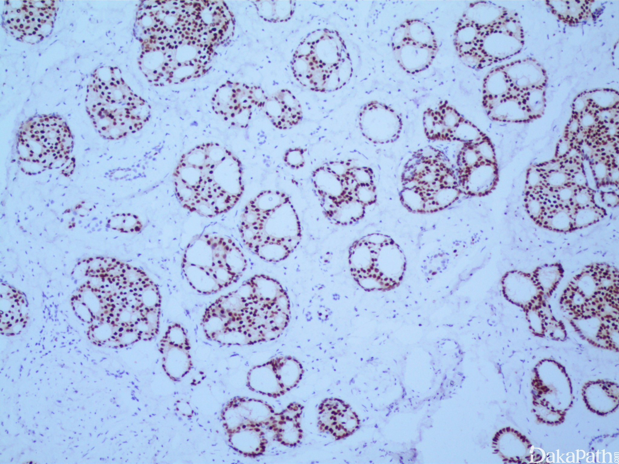 分子标记:与小管癌一样,在乳腺癌分子分型中同属于“管腔 A 型”,均一致表达 ER,缺乏 HER-2 表达。