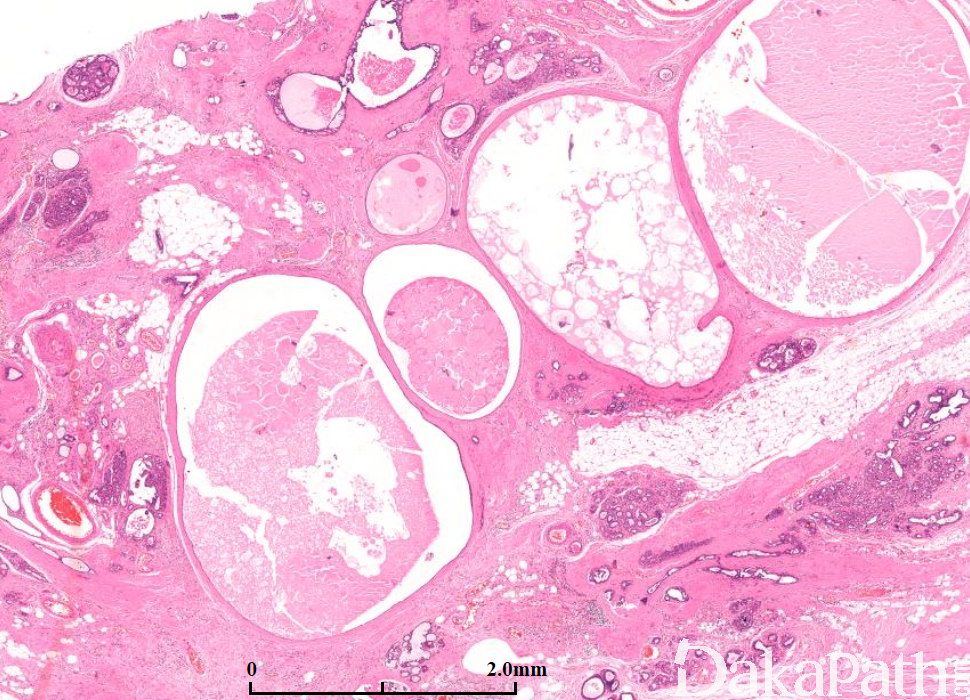 导管扩张,腔内可见泡沫样组织细胞、蛋白性分泌物、胆固醇结晶或钙化;
