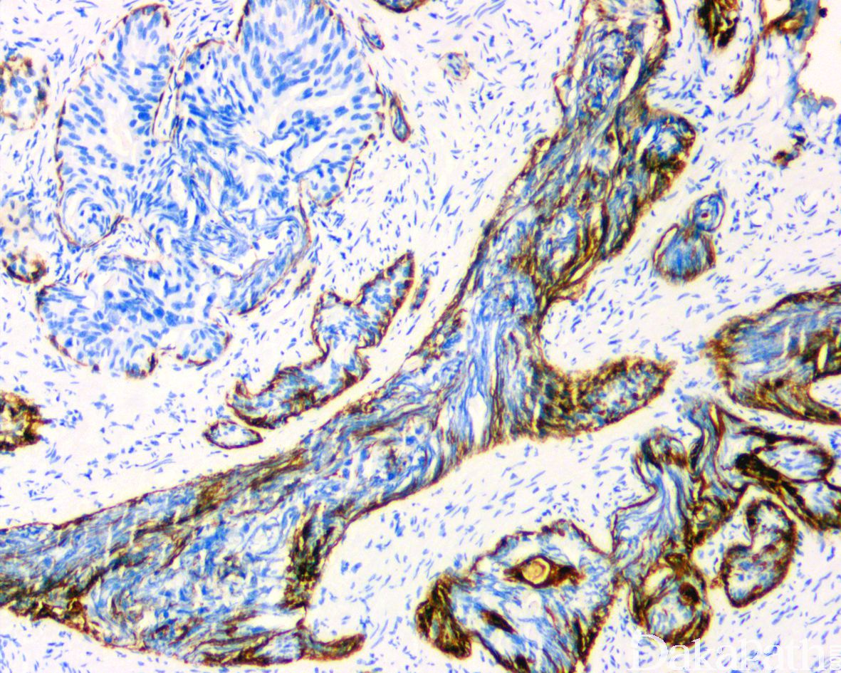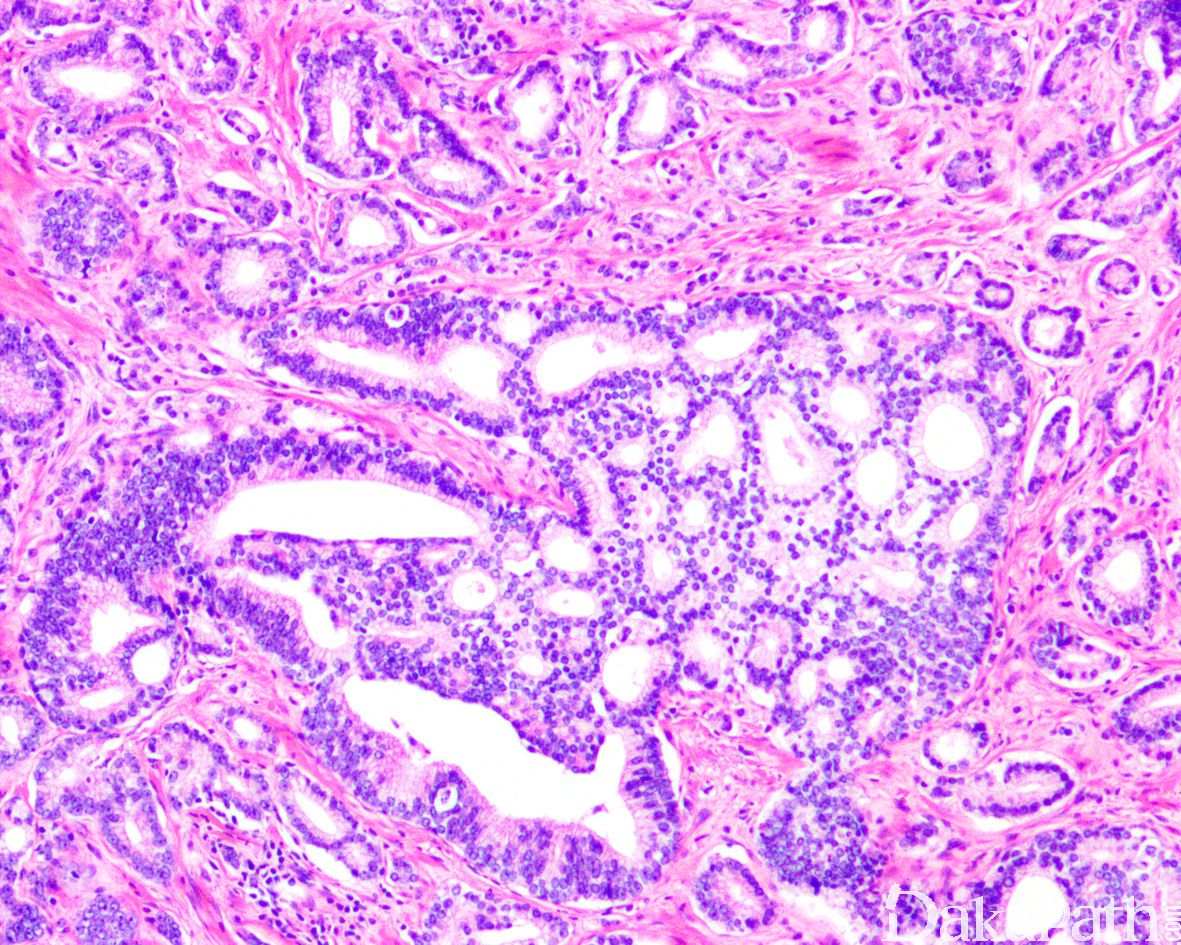 前列腺导管腺癌:导管腺癌是一种侵袭性的前列腺癌,起源并生长于前列腺尿道及尿道周围的导管内,偶尔可起源于周围带的腺体。大多数情况下,导管腺癌常伴随有侵袭性腺泡性腺癌但偶尔也可以单独存在。典型的导管腺癌组织学上表现为高柱状的假复层上皮排列成筛状结构伴有裂隙状腔隙和/或真性乳头形成,类似于子宫内膜样腺癌,其他的生长方式包括筛状、腺样或 PIN 样。导管腺癌的乳头具有真性的纤维血管轴心,被覆上皮可能具有明显的核异型性,以及较高的核分裂象和广泛的坏死;瘤细胞核大,多数为伸展的或卵圆形的,常含有单个的巨核仁。与之相反,IDC-P 的肿瘤细胞为立方形,筛状结构的腔缘较圆,微乳头状细胞簇无纤维血管轴心。与其他高级别前列腺癌一样,导管腺癌也易于出现导管内扩散。因此在导管腺癌周围通常可发现残存的基底细胞。从概念上来讲,导管腺癌伴有基底细胞就是 IDC-P,提出将导管腺癌分类到 IDC-P 的范畴内。但是基于 IDC-P 特征性的形态学表现以及并不是所有的导管腺癌周围都存在基底细胞,因此前列腺导管腺癌与导管内癌并不是同一个概念。