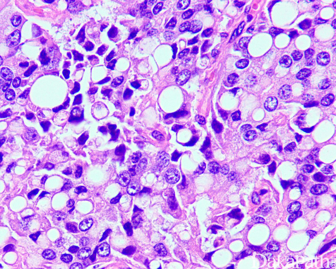 - 胞浆内空泡可见于任何亚型的前列腺腺癌中,前列腺印戒细胞样癌定义为在 Gleason 5 结构(单个细胞或条索状瘤细胞)基础上,出现胞浆空泡,似印戒样细胞,然而与真正的印戒细胞不同,瘤细胞胞浆浆为空泡,无黏液。