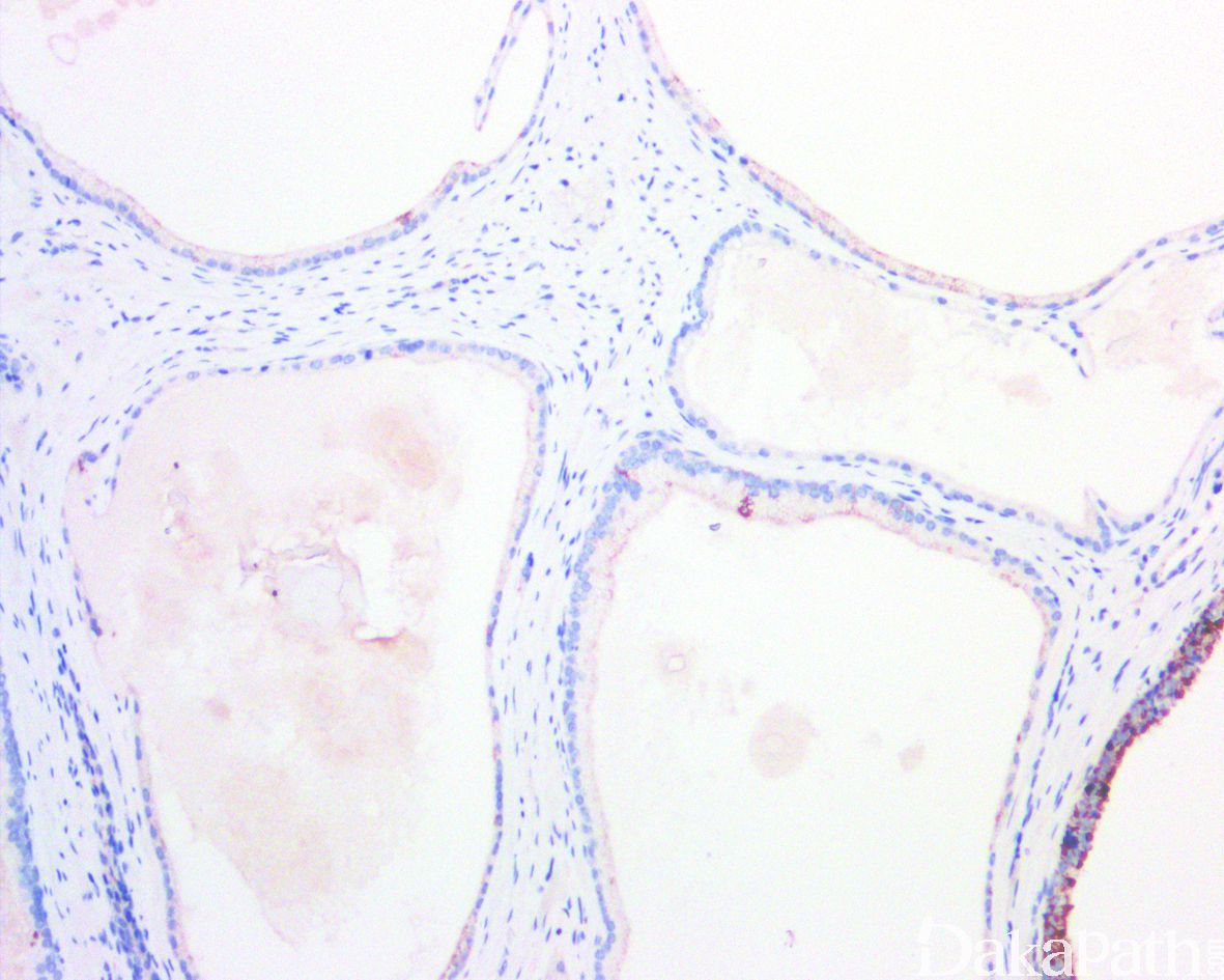 前列腺囊性萎缩:病灶尚保留小叶状结构,上皮细胞胞浆萎缩,核轻度增大,无明显增大的核仁,无伴随的普通腺泡性腺癌,免疫组化染色基底细胞无完全缺失。