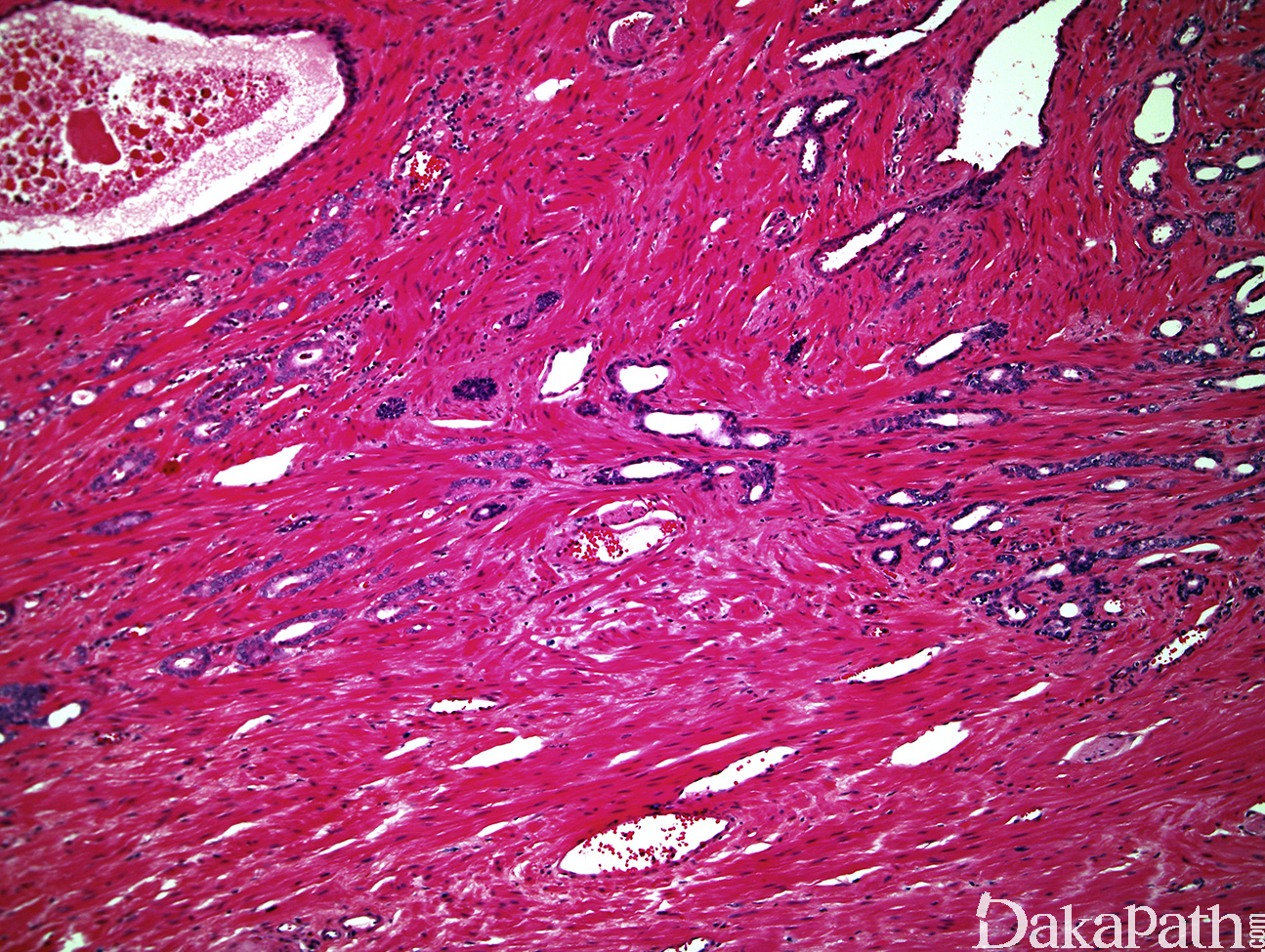 2. 某些良性萎缩可伴有腺体之间的纤维组织增生,而萎缩型前列腺癌没有这种组织学改变;