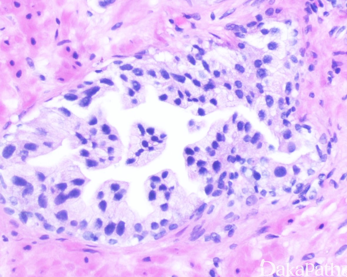 组织学表现为前列腺导管和腺泡分泌上皮的增生,组织结构主要有四种:簇状、微乳头状、筛状及平坦型;通常为多灶性,同一肿瘤内可有多种组织学类型;