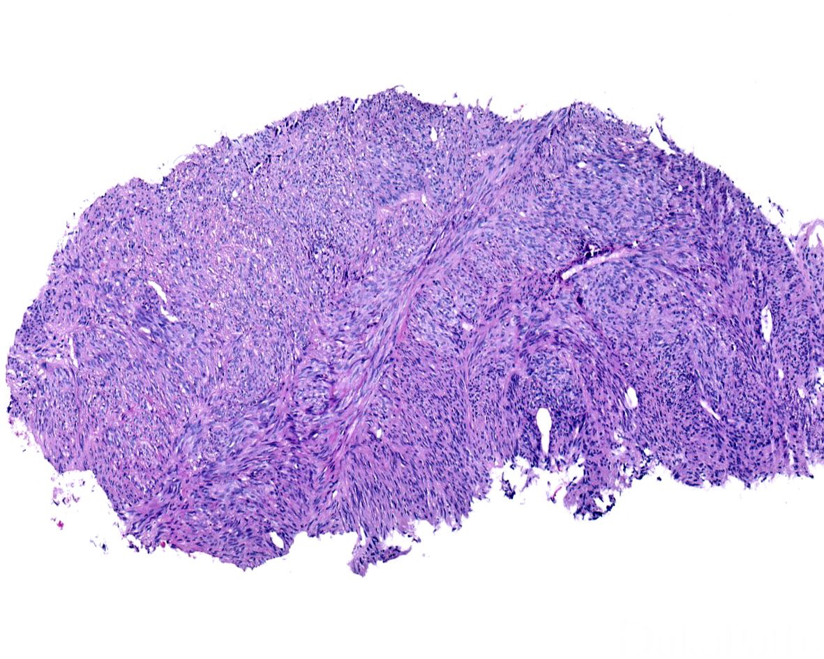 - 肿瘤直径 1-14cm,组织学上与胃肠道原发的 GIST 基本相似,致密的梭形细胞呈束状排列,可见核端空拍,部分可见上皮样肿瘤特征。