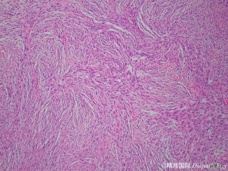 1. 梭性细胞束交叉排列,常呈席纹状;
