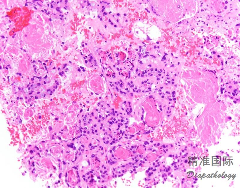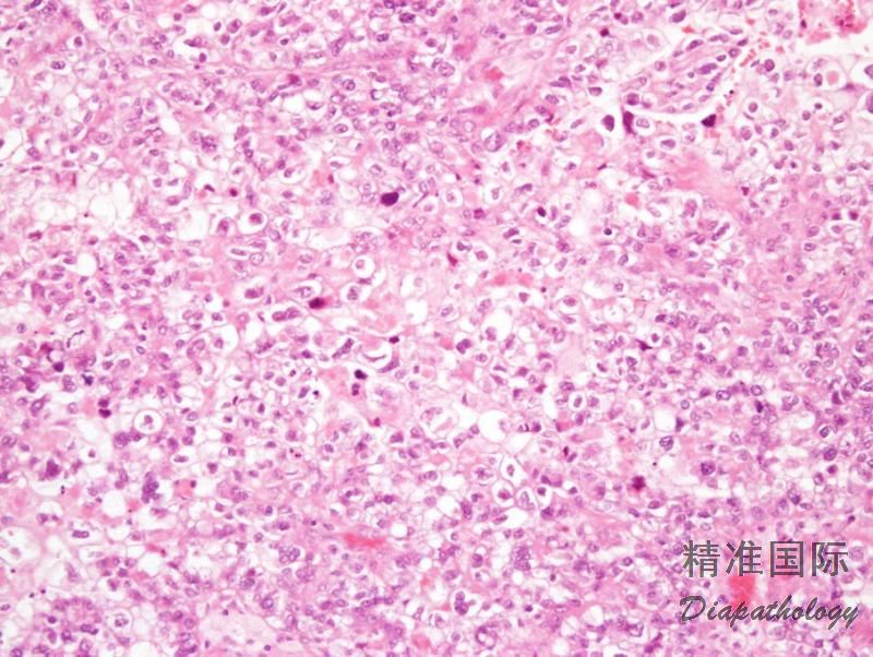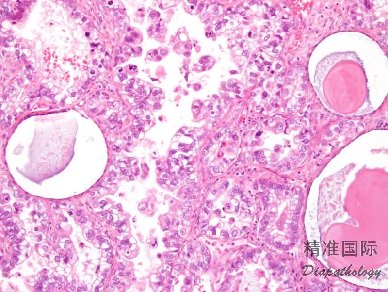 近 2/3 病例可见 PAS 阳性且耐淀粉酶消化的细胞内和细胞间透明小体,类似于卵黄囊瘤中的透明小体;