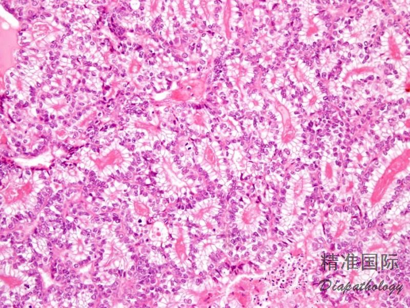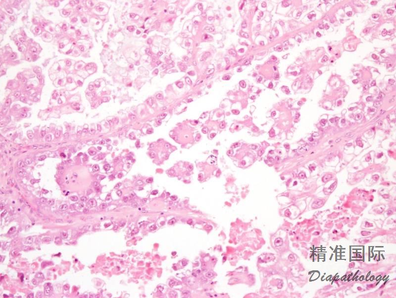实性结构常由大量透明细胞混杂嗜酸性细胞组成,而乳头状、管状和囊状结构主要由鞋钉样细胞组成(核大,突出于腺腔),其间散在透明和嗜酸性细胞;囊状结构常衬覆扁平细胞;