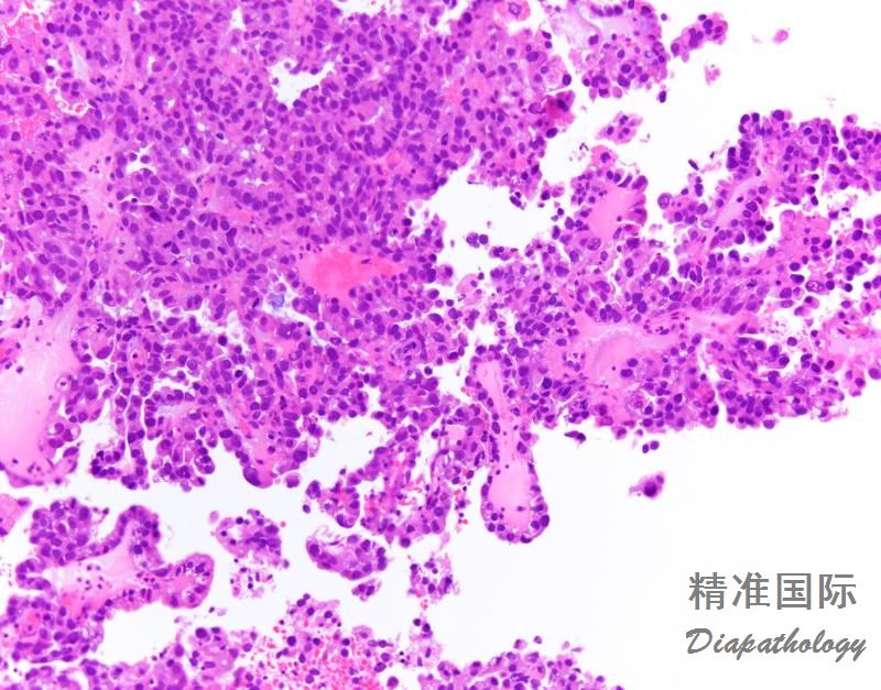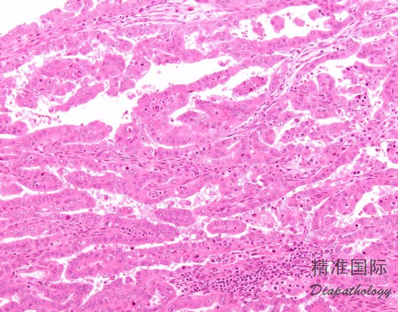 肿瘤呈实性、乳头状、管状和囊状结构,各种结构比例变化很大,可以以一种结构为主;