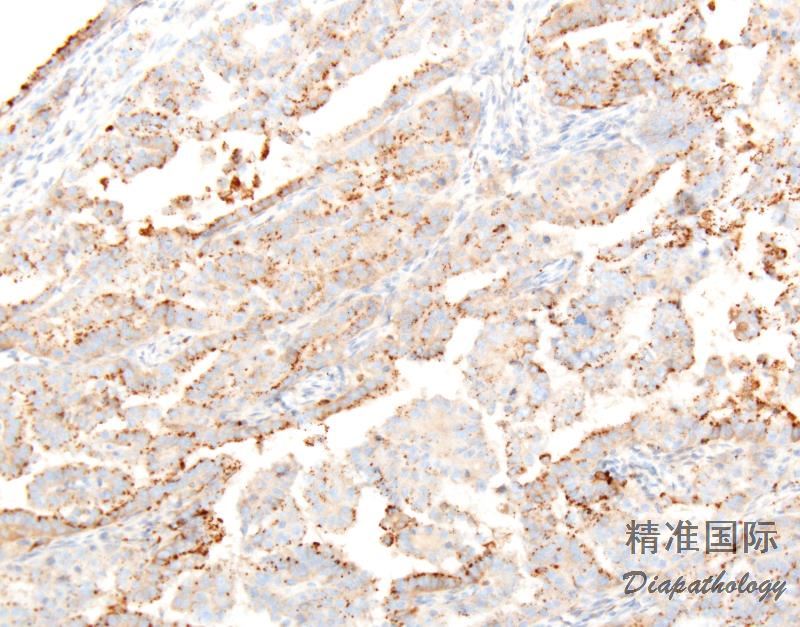 - 表达广谱 CK、CK7, EMA、 2. CA-125. BerEP4. B72.3 和 vimentin,CK20 和 WT1 常为阴性, CEA 阴性或弱阳性, ER、PR 常阴性。 3. napsinA 和 HNF-1beta 是最新的比较好的标志物,可以用来鉴别透明细胞癌跟子宫内膜样癌和浆液性癌。