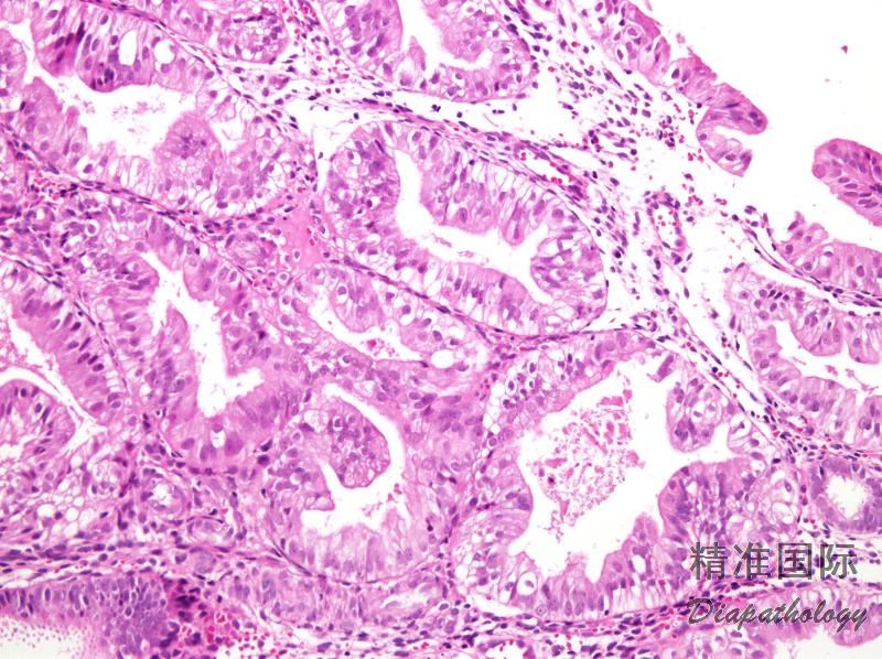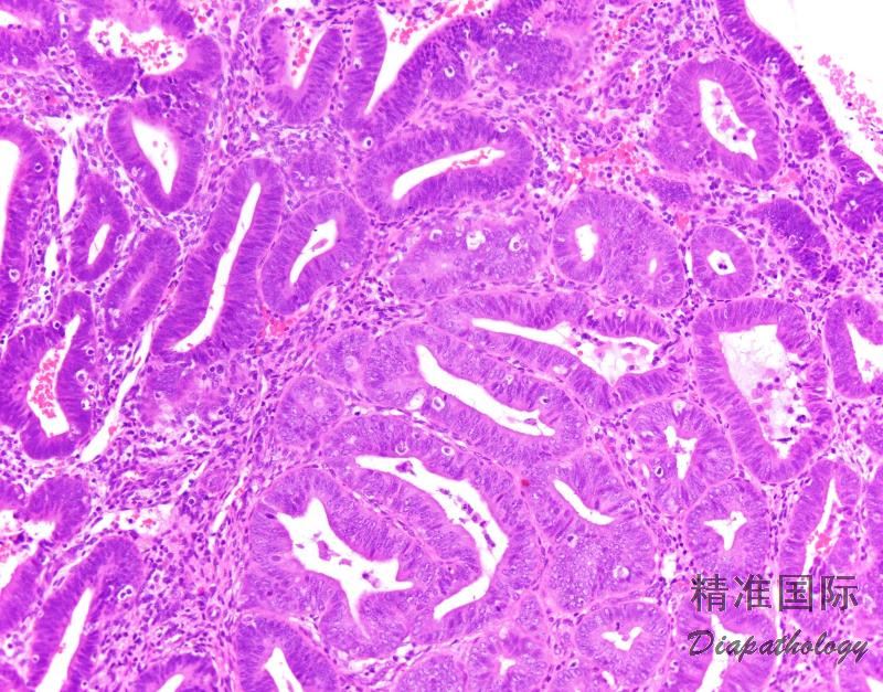 高分化子宫内膜腺癌 :与非典型增生的鉴别有时在刮宫标本中鉴别非常困难。间质浸润是鉴别两者的特征性标志,有助于识别间质浸润的 3 个标准是: