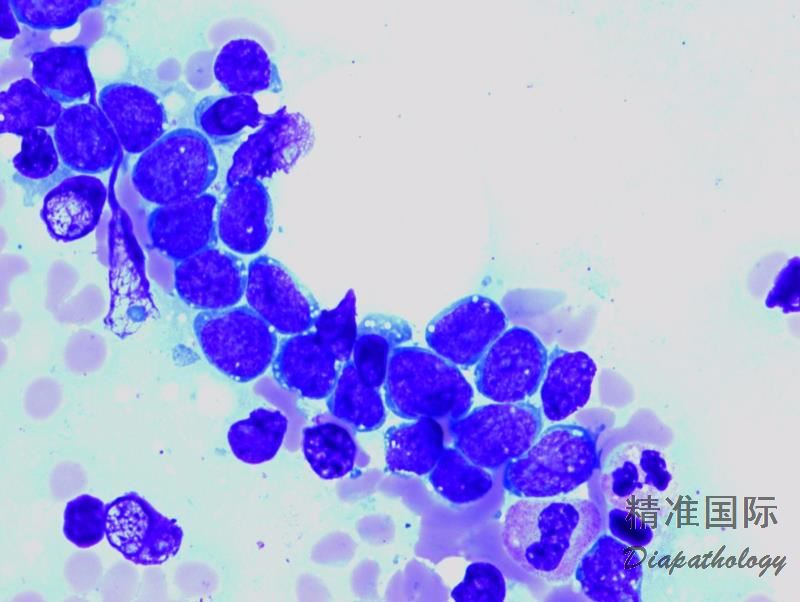 在骨髓或外周血涂片中,肿瘤细胞变化较大,可从小的圆形细胞、浆少、核浆比例高、染色质较致密、核仁不清楚的细胞形态(L1)到大的、胞浆相对丰富、核形不规则、染色质分散、多少不等的清晰核仁的细胞形态(L2)。有时可见到胞浆内空泡,这一形态学特点并不是 Burkitt 淋巴瘤所特有。
