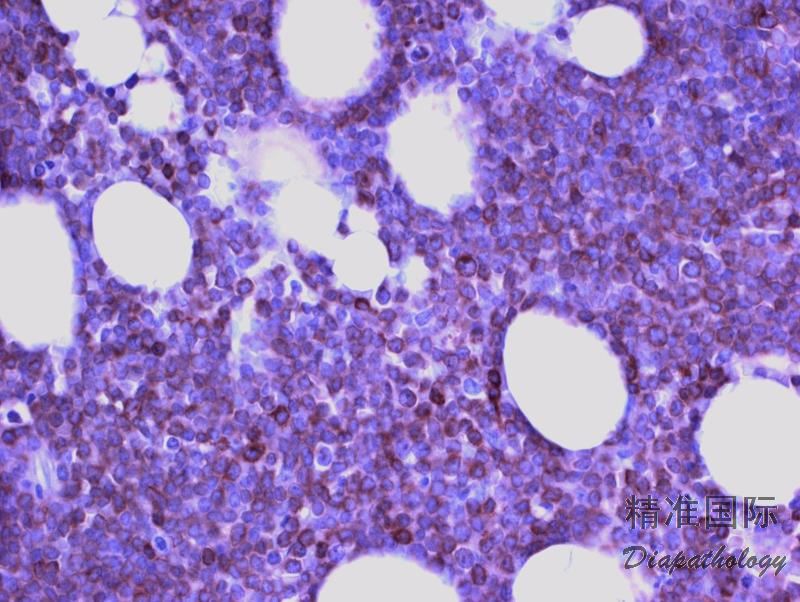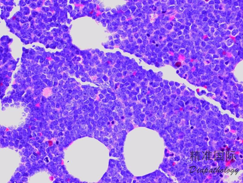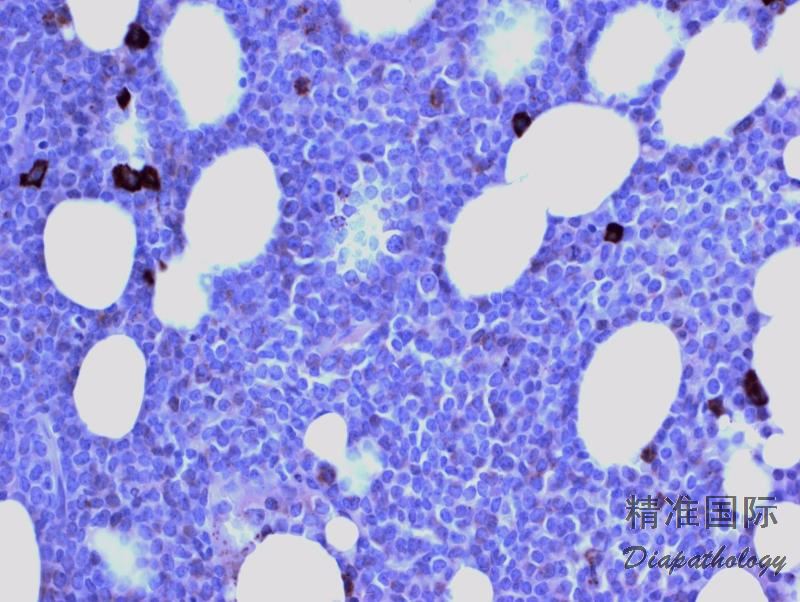- 正常前体 B 细胞(hematogones)反应性增生 :骨髓正常前体 B 细胞可反应性增生,尤其是儿童,增生可以非常明显,但一般为间质均匀分布,不会弥漫取代造血成分。细胞中等,染色质均匀,无明显核仁。抗原表达类似 B 淋巴母细胞,但呈现特有的分化成熟谱系如逐渐获得 CD20 并丢失 CD10. CD34 或 TdT。