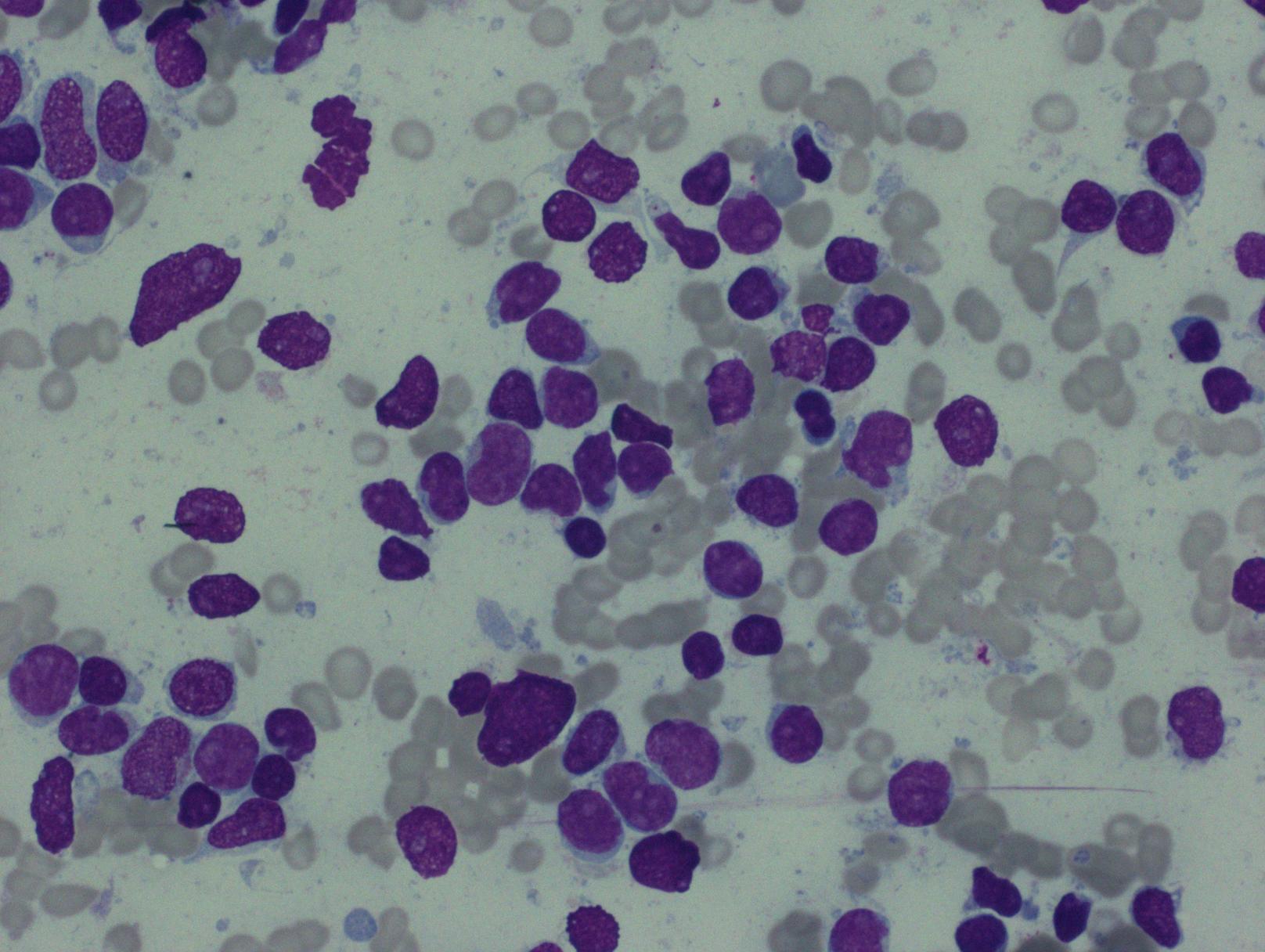 - 细胞形态学:母细胞可以具有髓系特征如胞质含稀疏颗粒甚至偶见 Auer 小体,但有的病例母细胞类似淋巴母细胞。