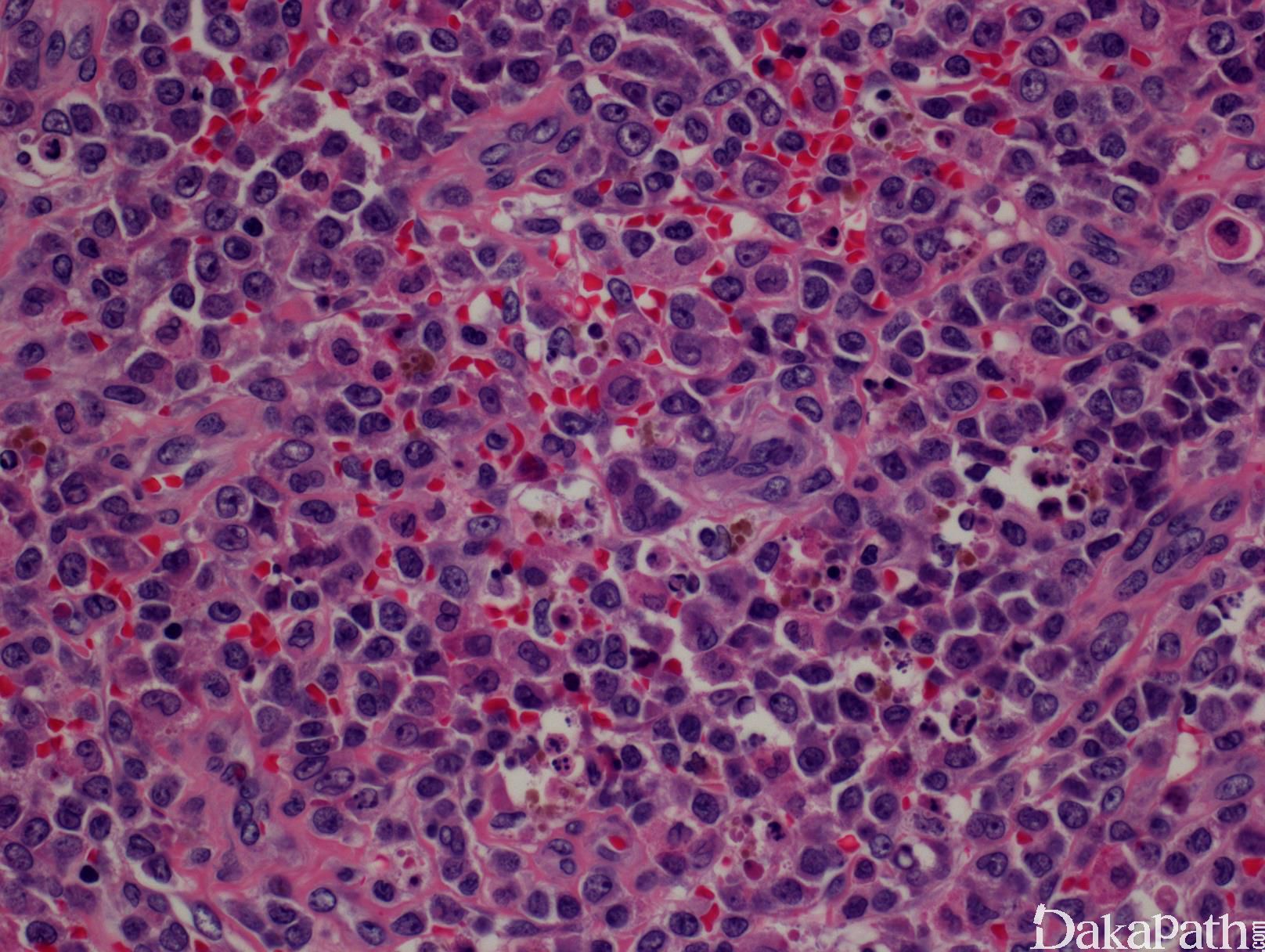1. 淋巴瘤 :髓系肉瘤细胞形态可以类似淋巴瘤,如弥漫大 B 细胞淋巴瘤、套细胞淋巴瘤亚型、淋巴母细胞淋巴瘤等。系统淋系及相关抗原检测和髓系抗原检测,有助鉴别。 需注意的是髓系肉瘤可表达 CD2. CD56. CD7,伴 t(8;21)的髓系肉瘤可表达 CD19 和 PAX5。