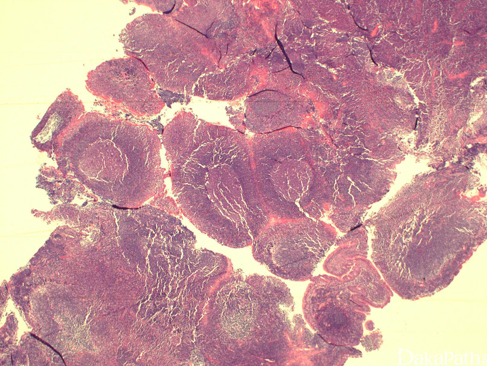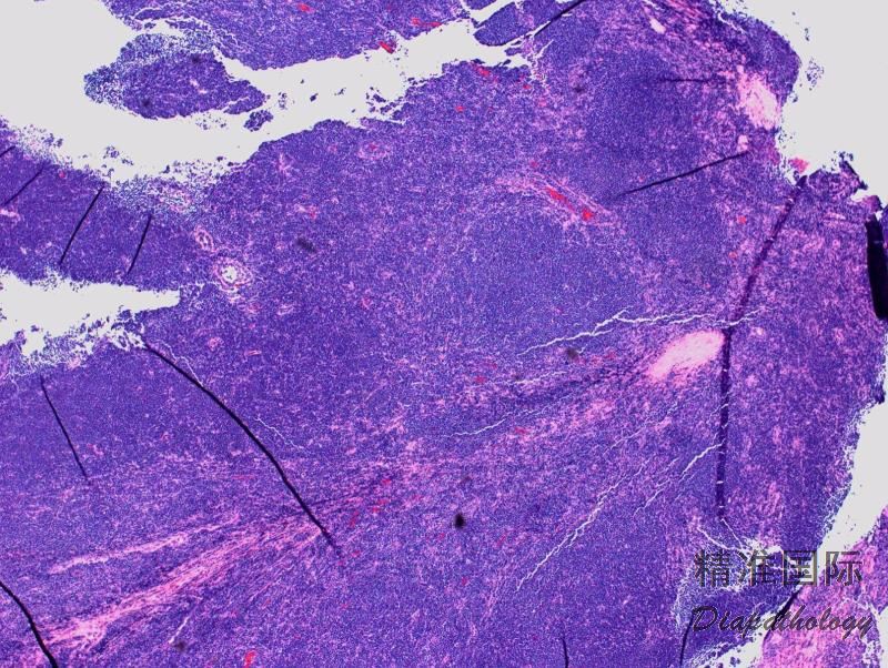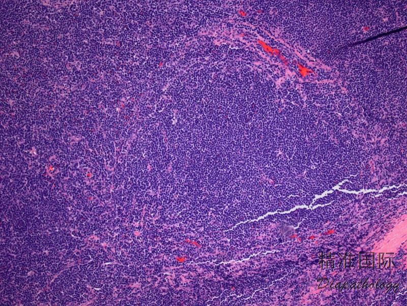 2. 淋巴结正常结构消失,肿瘤常以三种方式生长:沿套区侵润,结节状侵润,弥漫性侵润。以上三种生长方式可以混合存在。瘤细胞小到中等,大小一致,核不规则,胞浆少,无核仁。无转化细胞(中心母细胞)和增殖中心。可有散在上皮样组织细胞。