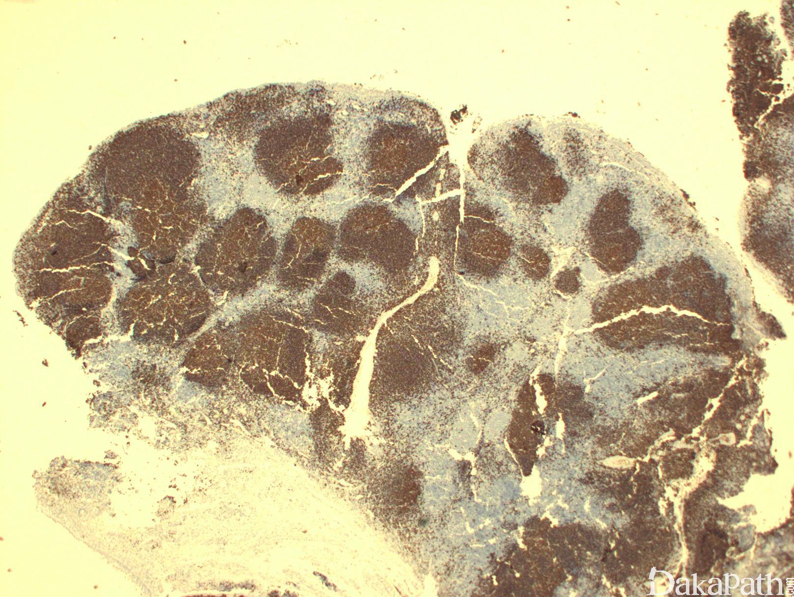 4. 滤泡性淋巴瘤 :异常结节(生发中心)由中心细胞和中心母细胞组成,表达 CD10 和 Bcl-6,但不表达 cyclin D1。