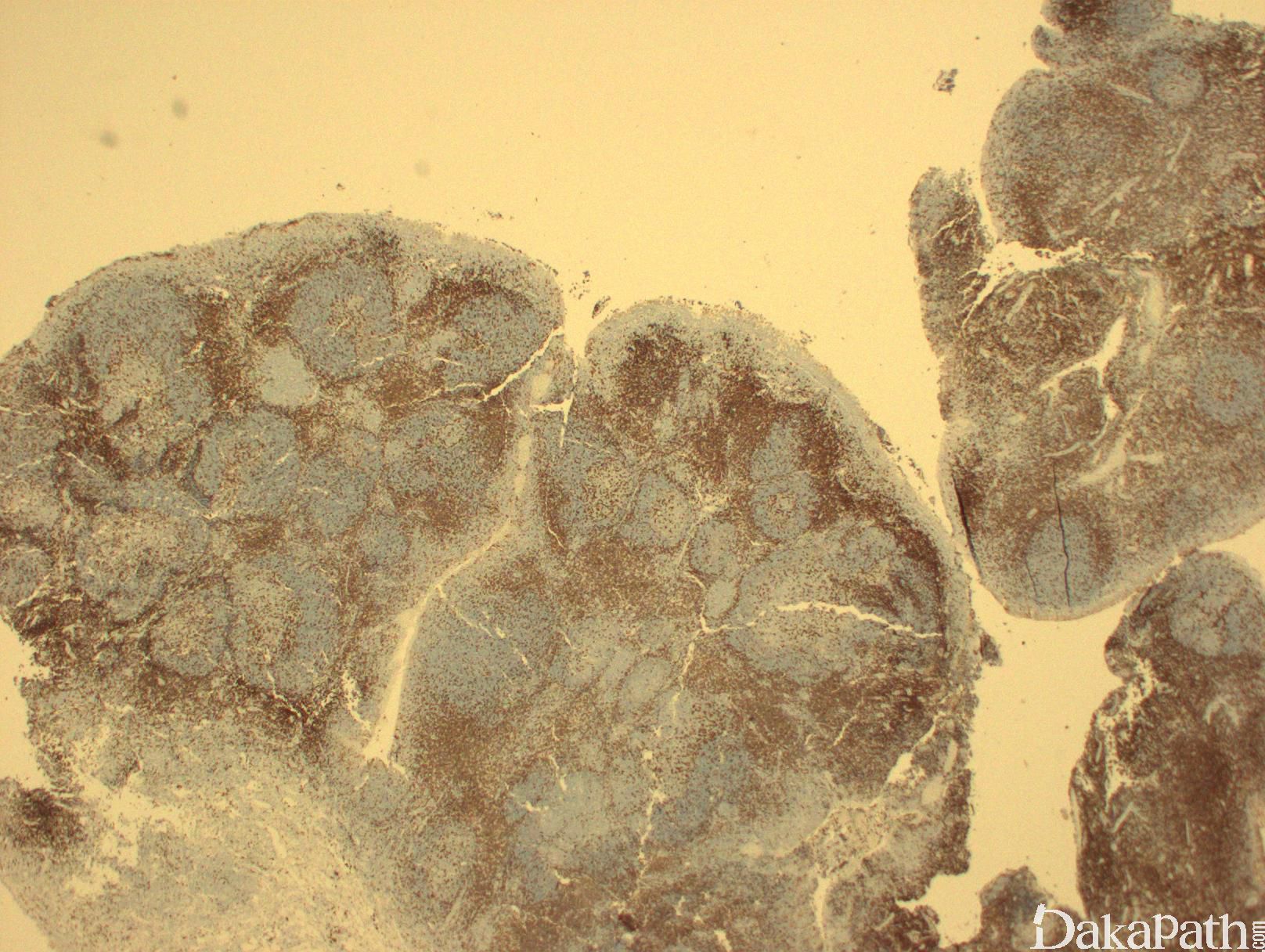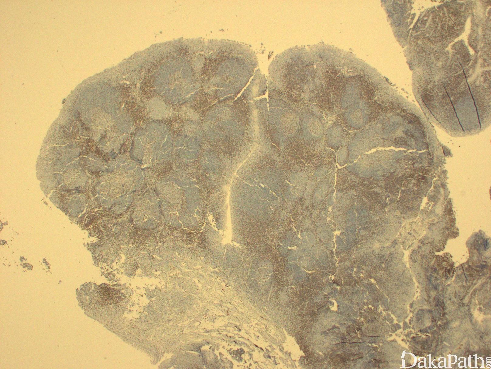 3. 慢性淋巴细胞白血病/小淋巴细胞淋巴瘤 :组织学存在增殖中心,由小淋巴细胞,幼淋细胞和副免疫母细胞混合构成。CD20 和轻链弱表达,不表达 cyclin D1。慢性淋巴细胞白血病和免疫学与白血病样非结性 MCL 形态学可相似,免疫学也有相似之处(如两者多可以 CD5+、SOX11-),但后者 cyclin-D1+/t(11;14)+。
