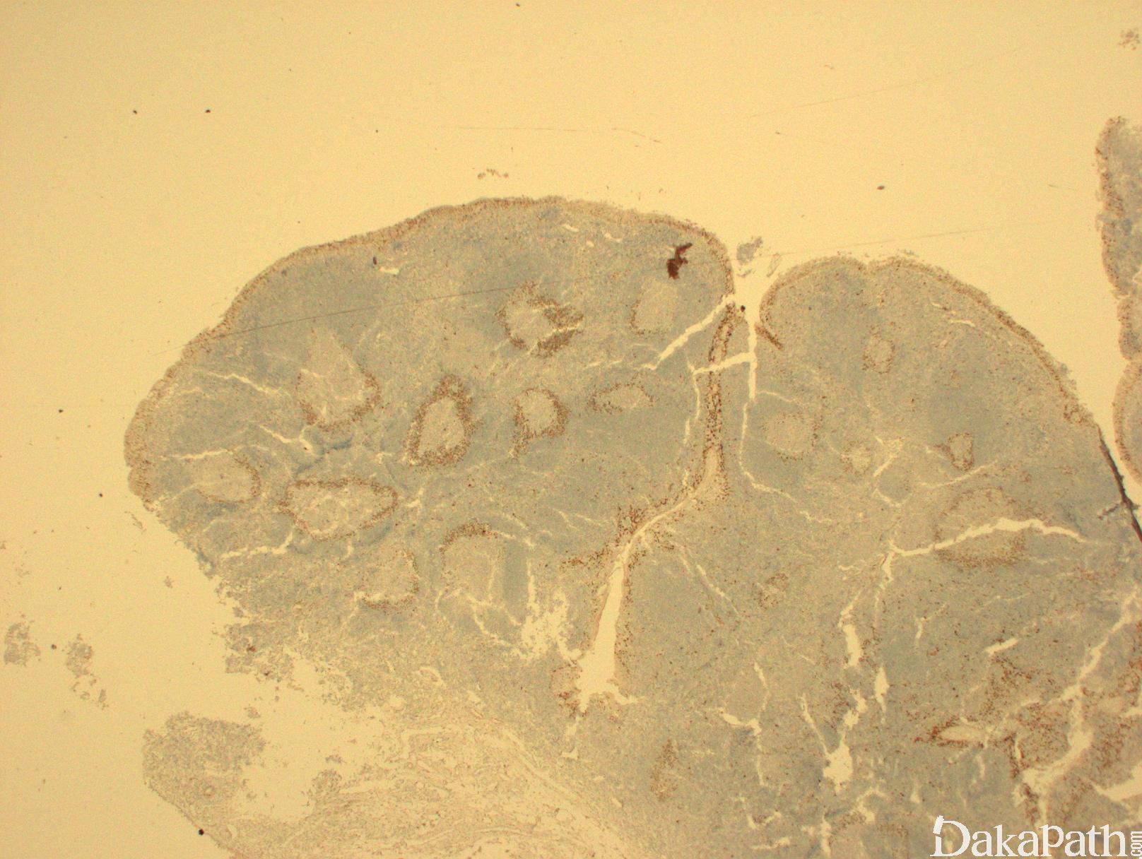 1. 原位套细胞瘤变(in situ mantle cell neoplasia): 背景为反应性改变(滤胞增生),Cyclin-D1+/t(11;14)+瘤细胞通常仅累及套的内侧或内圈,偶也可累及套区外侧部分或散在累及整个套区、或累及滤胞内。外周血发现循环瘤细胞不影响对原位套细胞瘤变的诊断。免疫组化经常 CD5 阴性,部分病例 SOX11-,有些可能系白血病样非结性套细胞淋巴瘤累及淋巴结或结外组织。需注意与 MCL 套区生长模式相鉴别,如果整个套组弥漫累及伴套区扩大,应诊断为 MCL 为宜。原位套细胞瘤变患者临床过程惰性,可长期存活,但有的同时伴有其它淋巴瘤或进展成典型的 MCL。