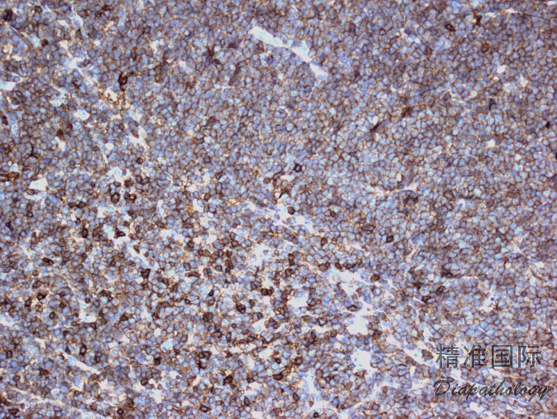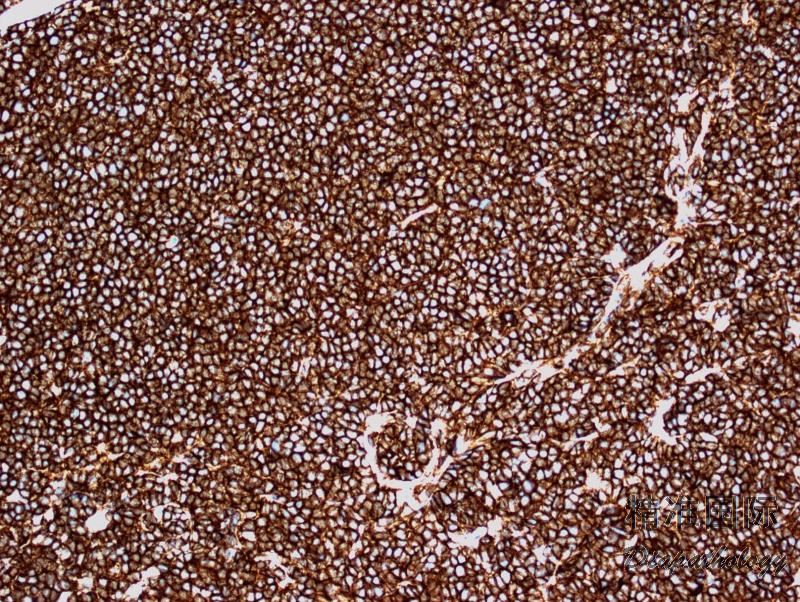 表达 B 细胞抗原并共表达 CD5(CD43 也可阳性),cyclin D1. SOX11 阳性。在流式,CD20 和轻链中等强度阳性,这一特点有助于与 CLL 鉴别。