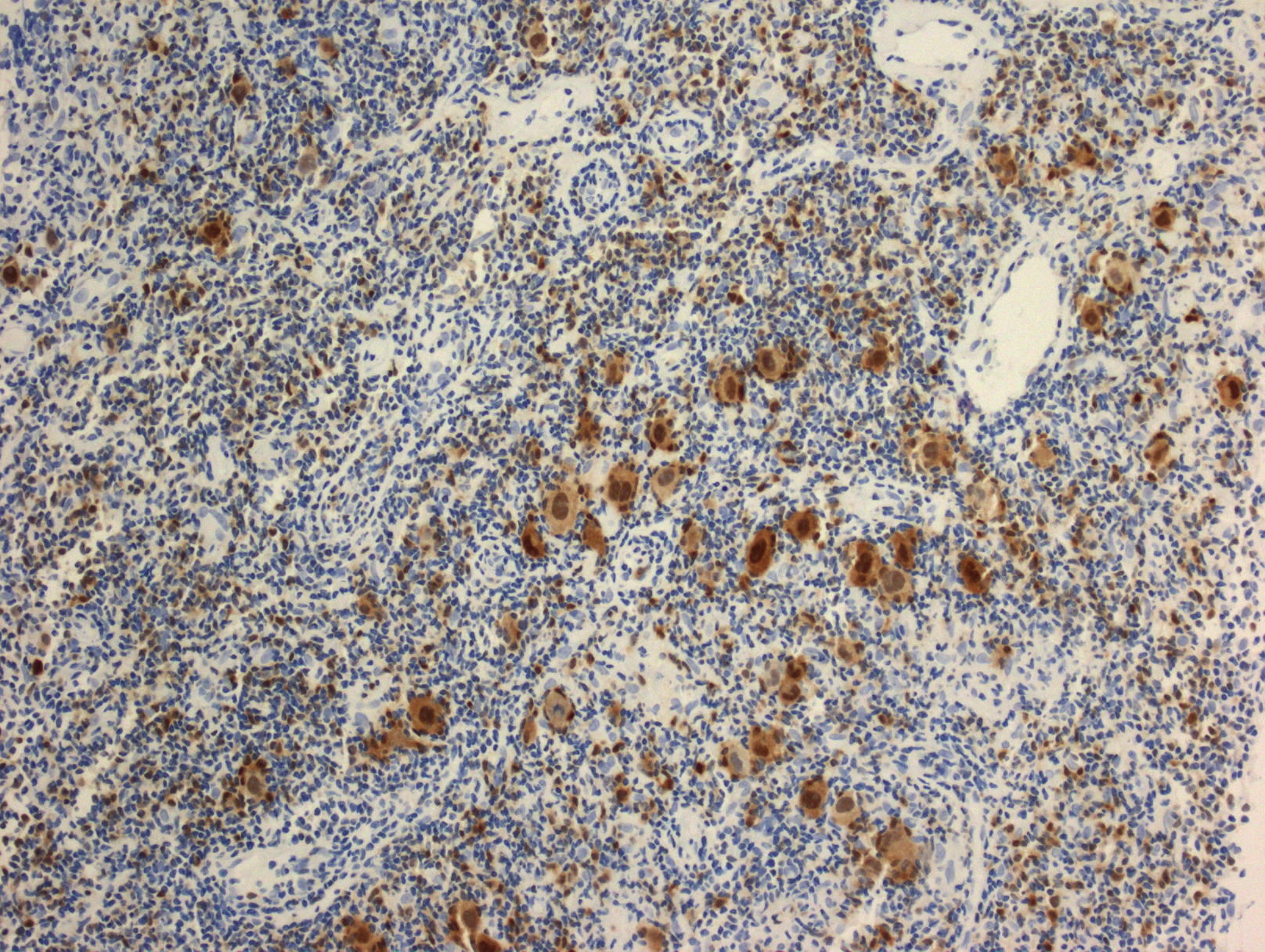 2. 经典型霍奇金淋巴瘤 (CHL):混合细胞型常为弥漫模式,但背景细胞系混合炎性细胞,常有粒细胞和浆细胞。典型 Reed-Sternberg 细胞或 Hodgkin 细胞,其免疫表型:CD30+,CD15+/-,EBER 常可阳性,CD79a-,CD20 也常阴性或仅部分细胞阳性(强弱不等)。