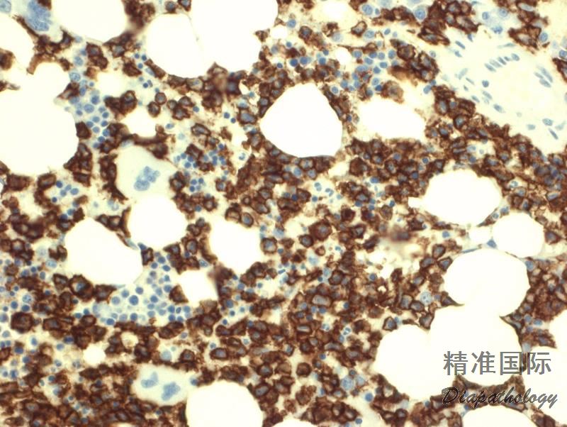 3. 骨髓间质弥漫侵润,但瘤细胞不聚集成结节。免疫组化 CD20 染色,瘤细胞呈“煎鸡蛋”样形状。有显著网织纤维化。