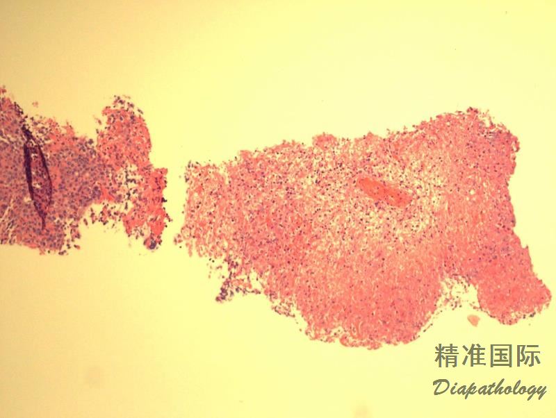 - 移植后淋巴增殖性疾病(PTLD) :与 LyG 相似,存在坏死和 EBER+ 细胞,但肿瘤表现为非典型 B 细胞弥漫侵润,细胞多形、大小不等,可伴浆细胞分化,T 细胞少。有器官移植病史。