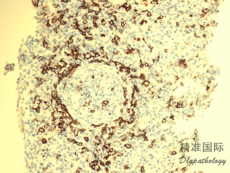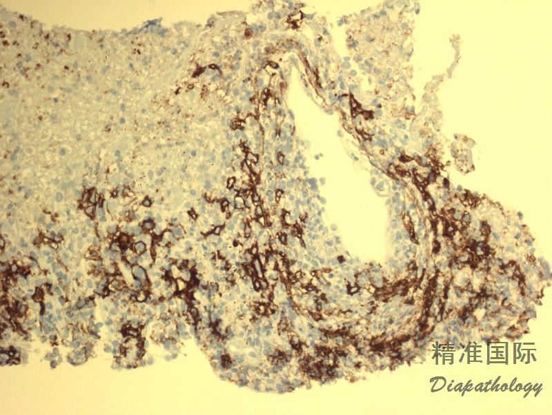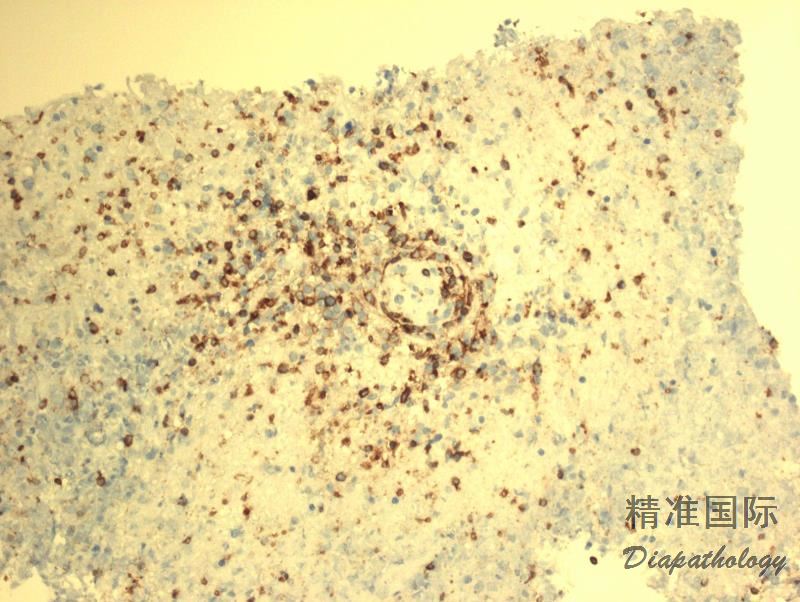- 经典型霍奇金淋巴瘤(CHL) :大量炎性细胞胞包括小淋巴细胞、组织细胞、浆细胞和嗜酸性粒细胞,混有散在的 HRS 细胞(有时可形成松散聚集),表达 CD30. CD15,但 CD79a 一般阴性,CD20 阴性或部分细胞不同程度的阳性,EBER-/+。可有局灶坏死,但无血管中心性坏死倾向。