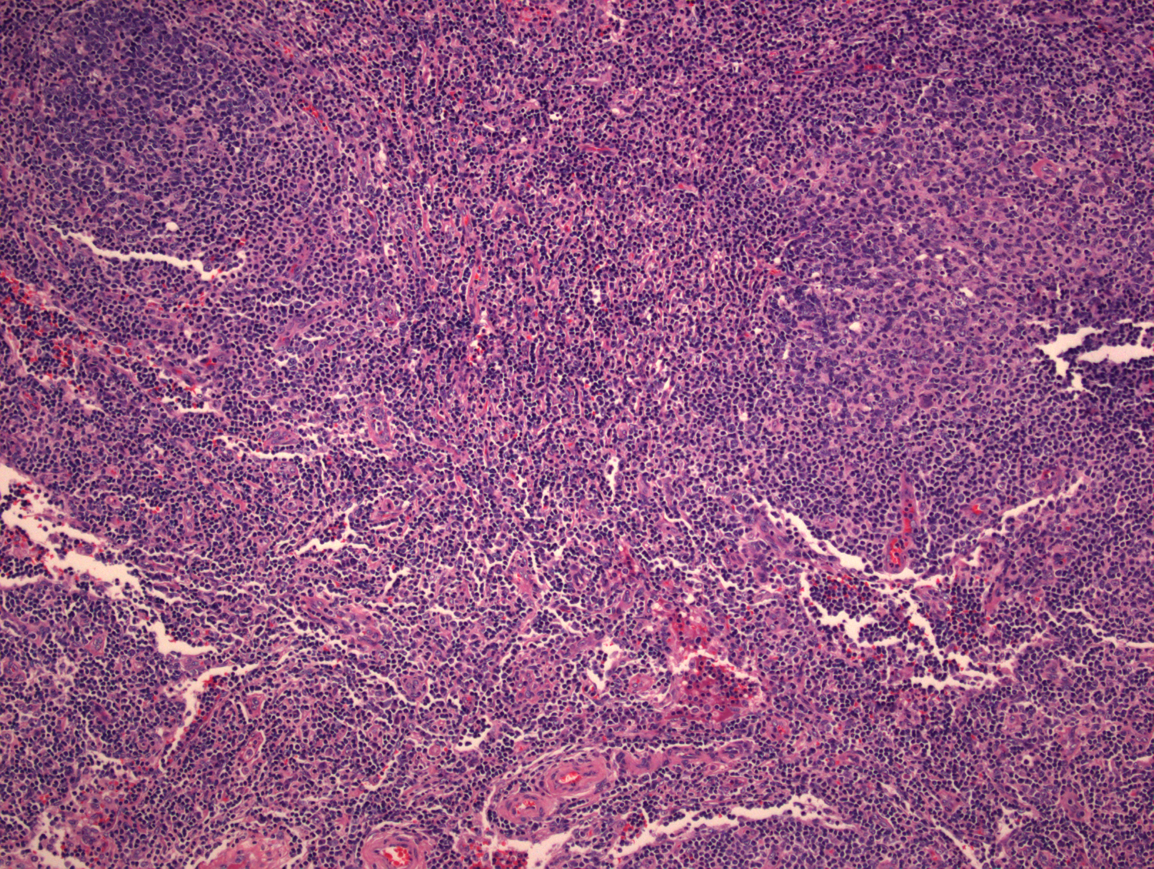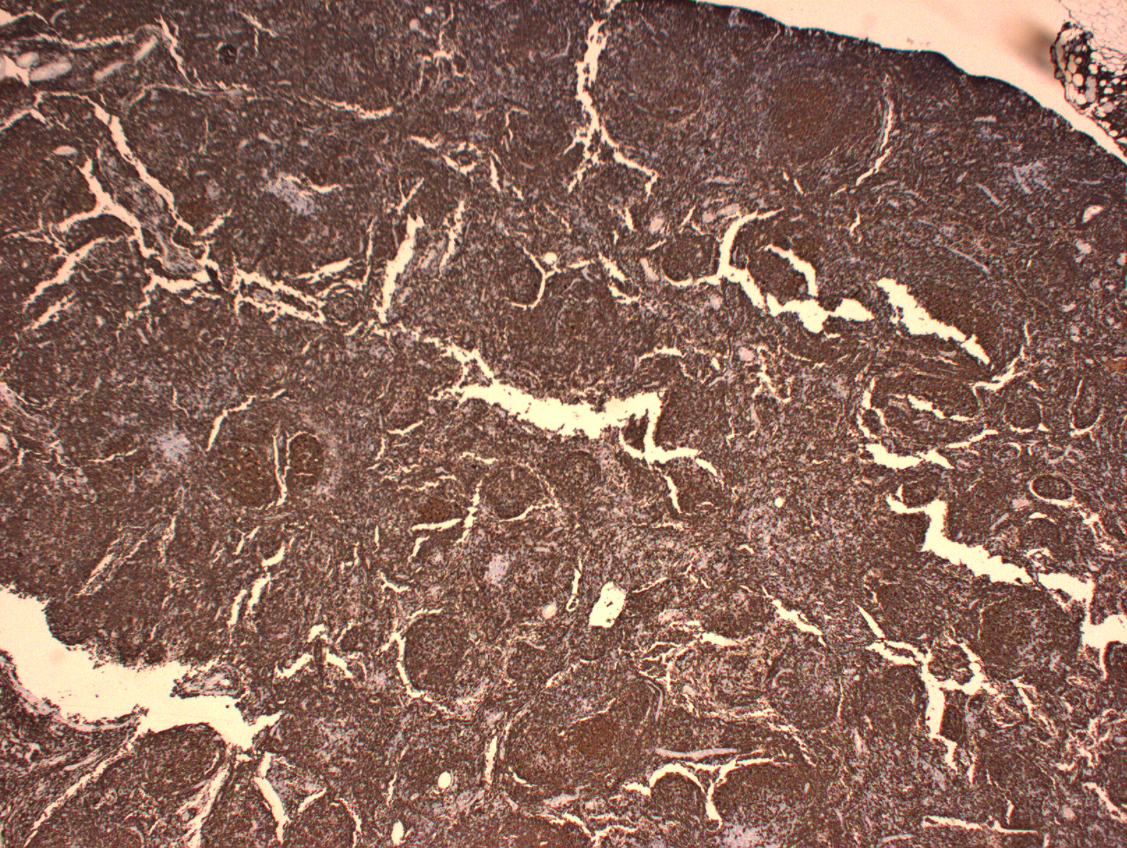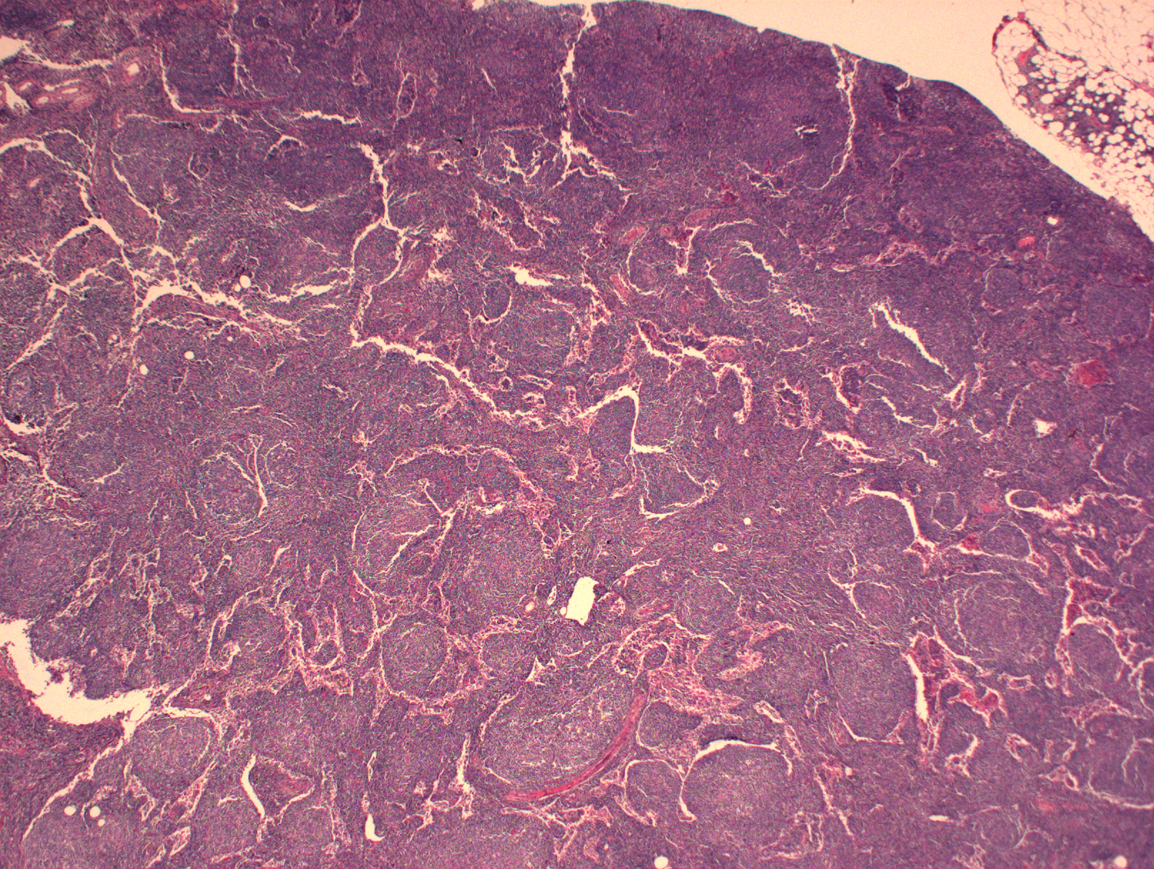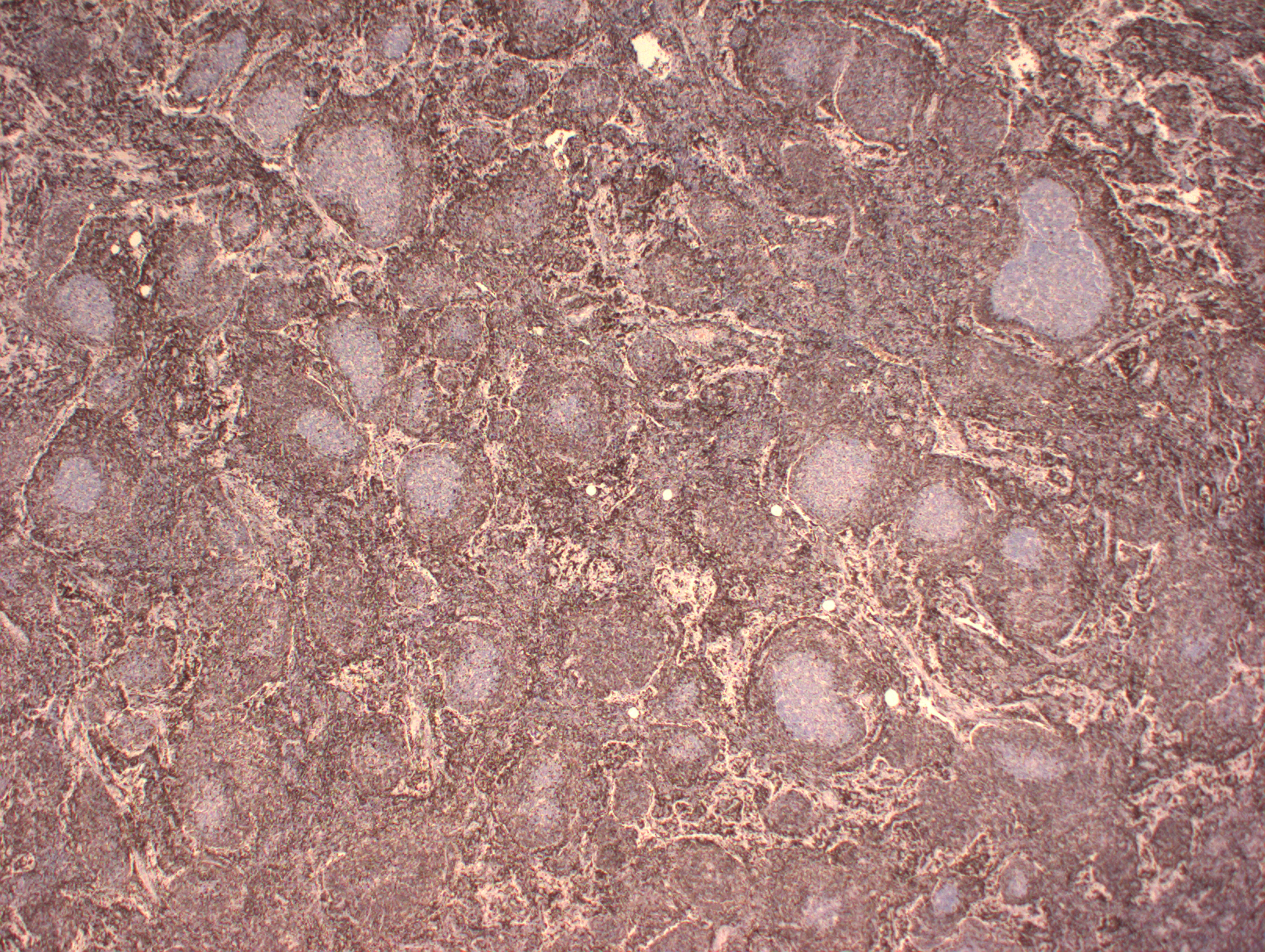 - 肿瘤细胞沿边缘区或滤泡间增生,导致边缘区或滤泡间扩张,可见残存滤泡;或更广泛弥漫浸润致淋巴结正常结构不复存在。