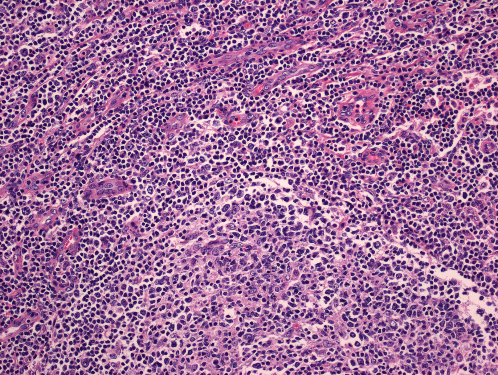 - 淋巴浆细胞淋巴瘤 (LPL):两者在形态学和免疫学特点经常重叠。NMZL 的细胞组成常较为多形性,而组成 LPL 细胞相对为形态单一的小细胞和浆细胞,后者常含 Dutcher 小体,窦区结构常保留。血浆电泳检测到较明显的 IgM 峰值,有 MYD88 体细胞基因突变。