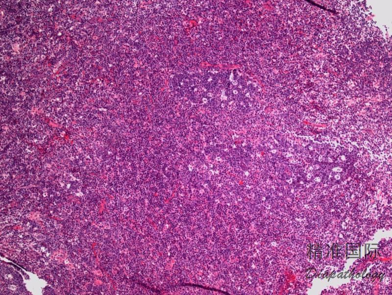 - 有时会发生广泛的瘤细胞滤泡内“植入”, 形态上易与滤泡淋巴瘤混淆。