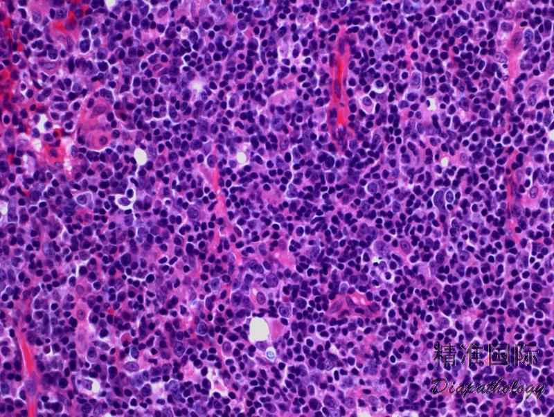 - 肿瘤细胞形态多样,呈单核样、中心细胞样和浆细胞样,并总是混有散在的转化细胞或淋巴母样/免疫母样细胞。时转化细胞数甚至超过 20%,但其中混有小淋巴细胞,且多见于植入的滤泡。