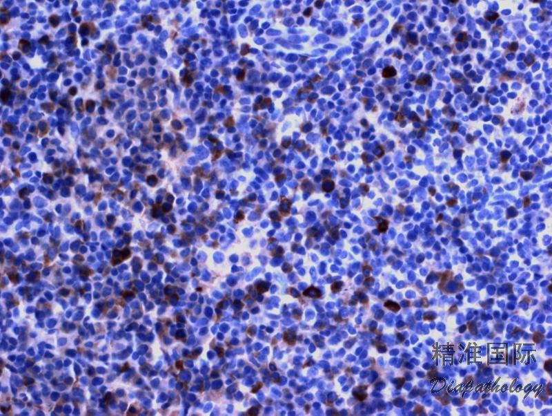 - 弥漫性大 B 细胞淋巴瘤 (DLBCL):当 NMZL 呈现弥漫生长并有大量转化细胞(中心母细胞样或免疫母细胞样)时,须与 DLBCL 或 DLBCL 转化鉴别。一般认为,只由大细胞呈实性片状时,才诊断为 DLBCL。