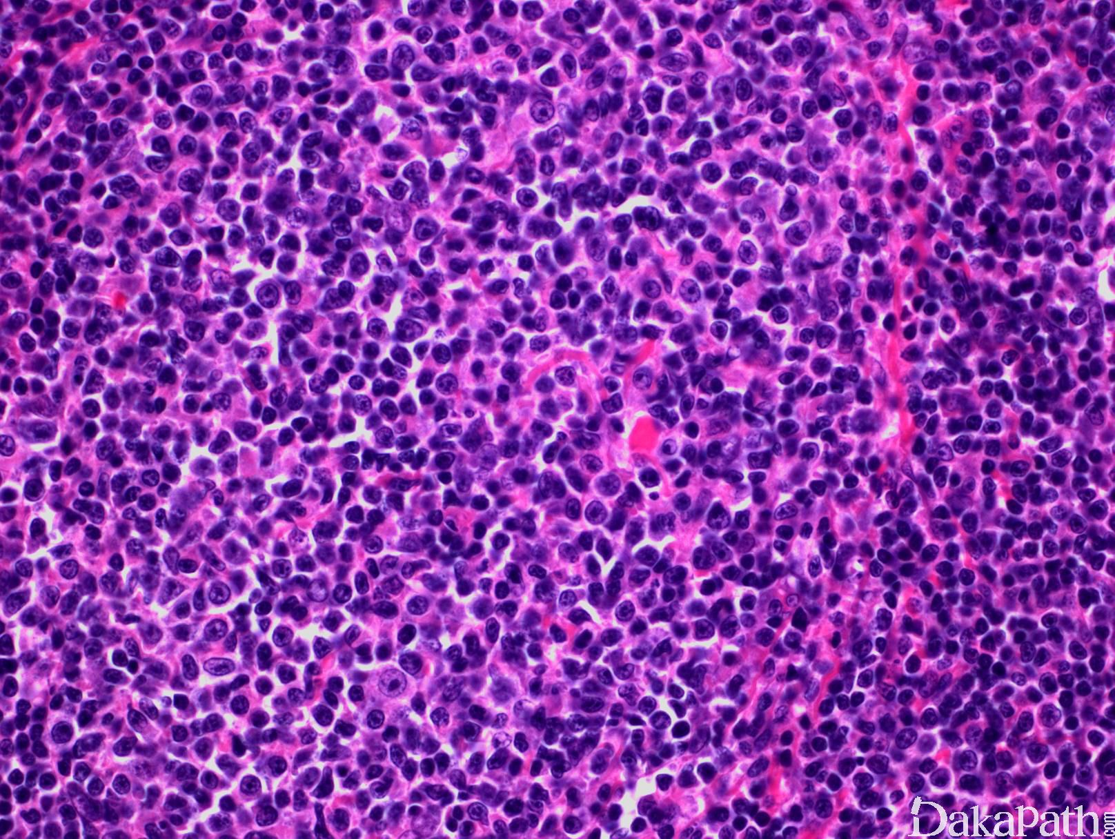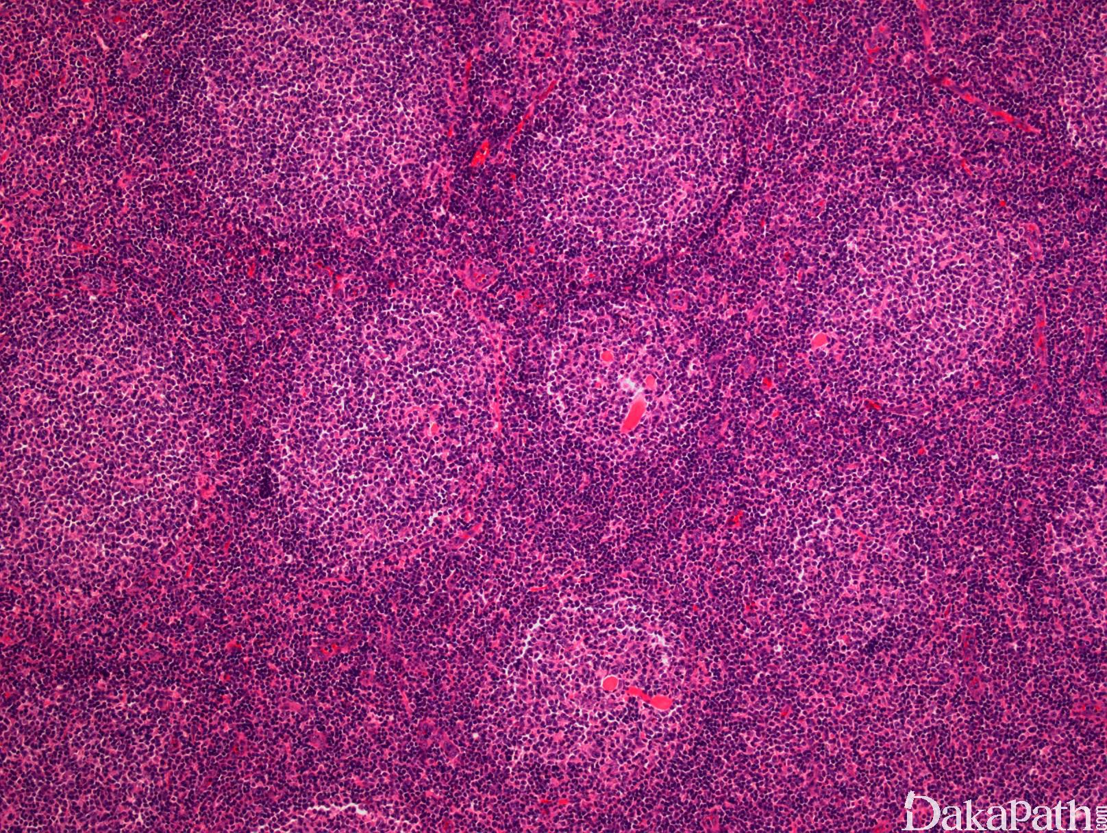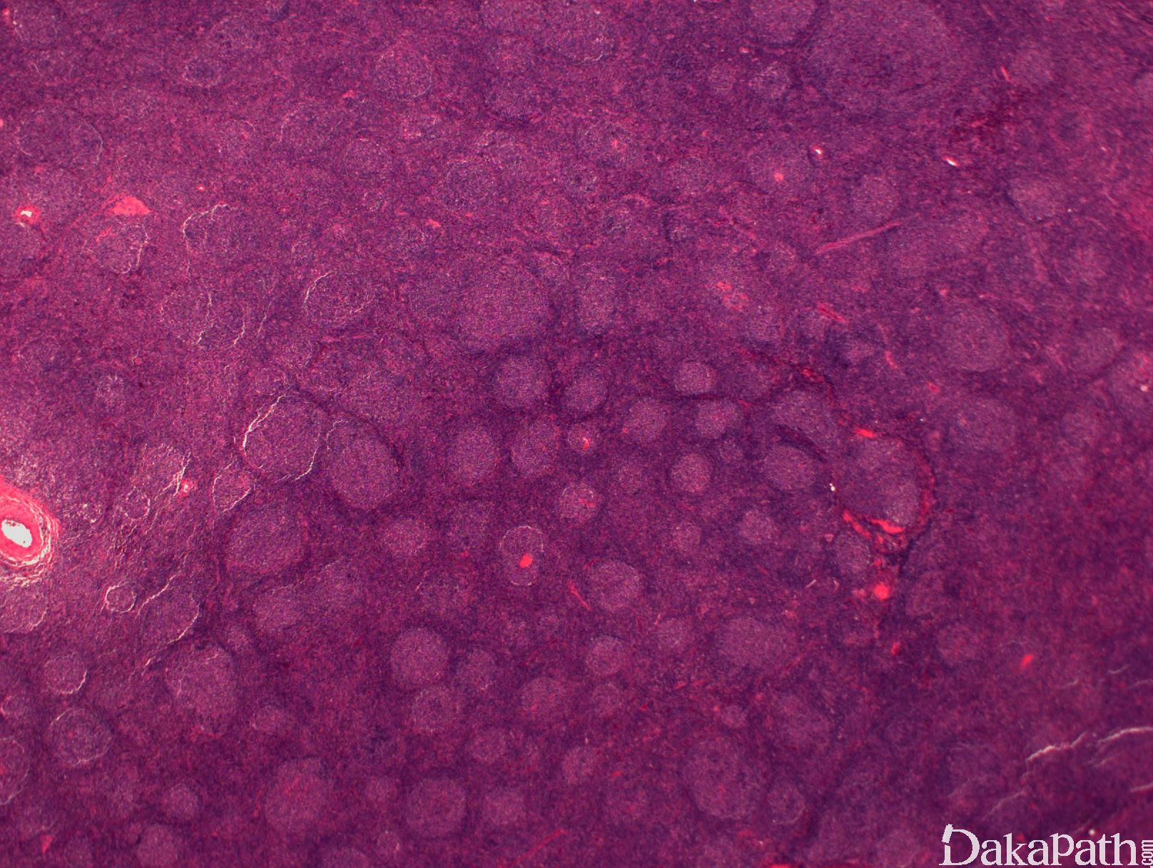 淋巴结正常结构消失,代之以紧密排例、大小和形状一致的不正常滤泡,常累及整个淋巴结或浸润到胞膜外。套区变薄、不完整、消失或极性不在。有的同时存在弥漫浸润区。偶而滤胞呈现出形状不规则或匐行性生长(类似进行性滤胞中心转化, PTGC)。